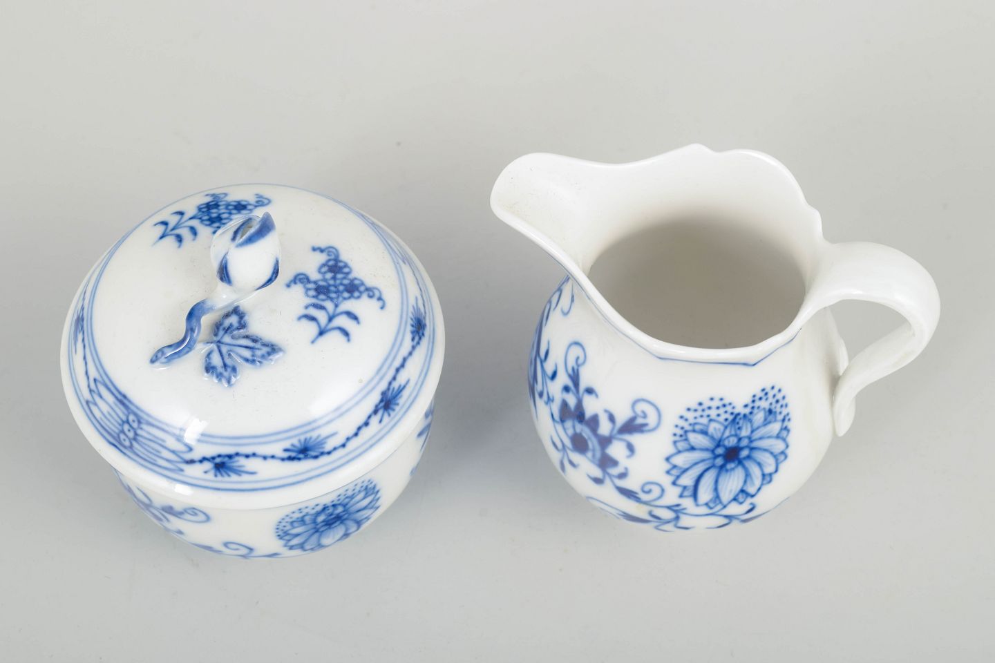 Meissen løgmønstret sukkerskål og flødekande, midt 1900-tal.