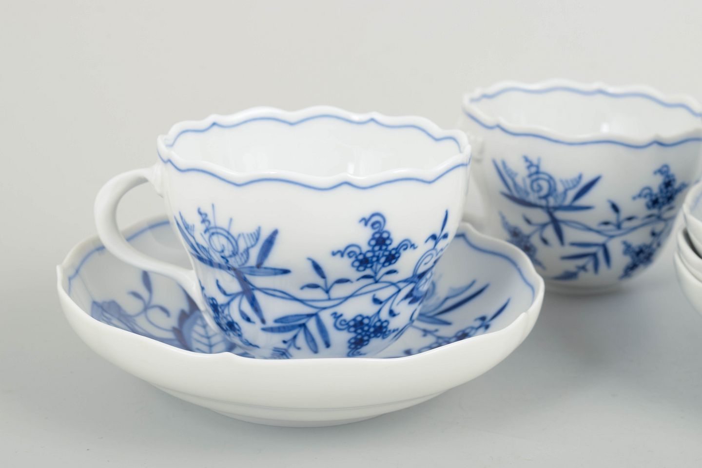Sæt med fire Meissen-kaffekopper med tilhørende underkopper i det klassiske løgmønstret (Zwiebelmuster).
