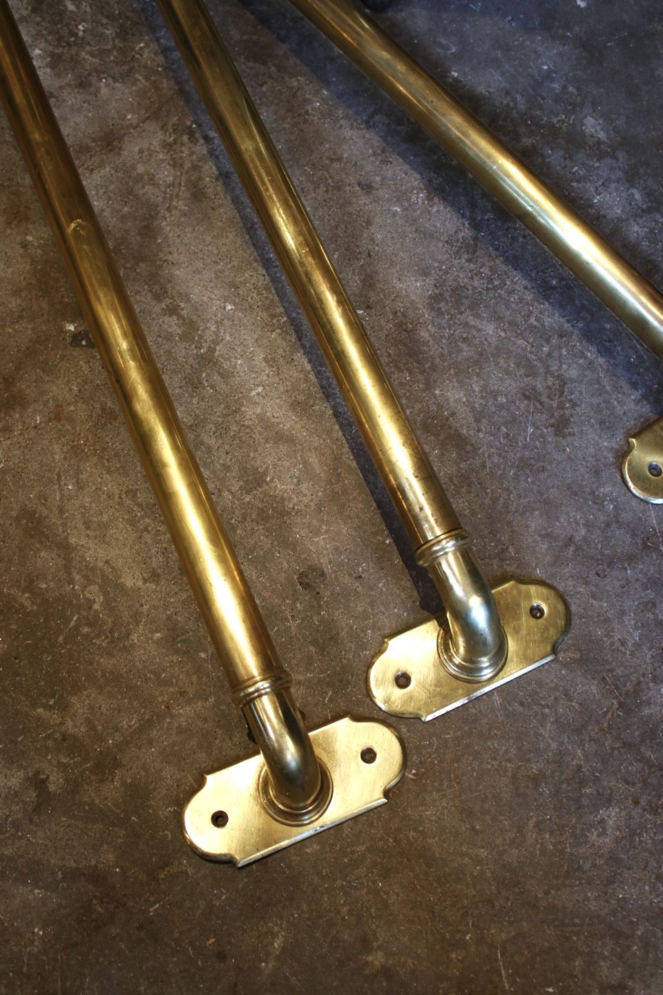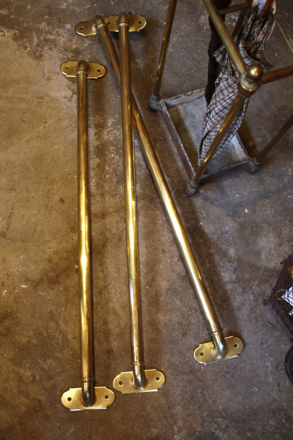 Gamle messing stænger til at skrue op på væg i kraftig kvalitet og med en rigtig fin patina. Længde: 106cm. - 2 stk. Længde: 96cm. - 1 stk.