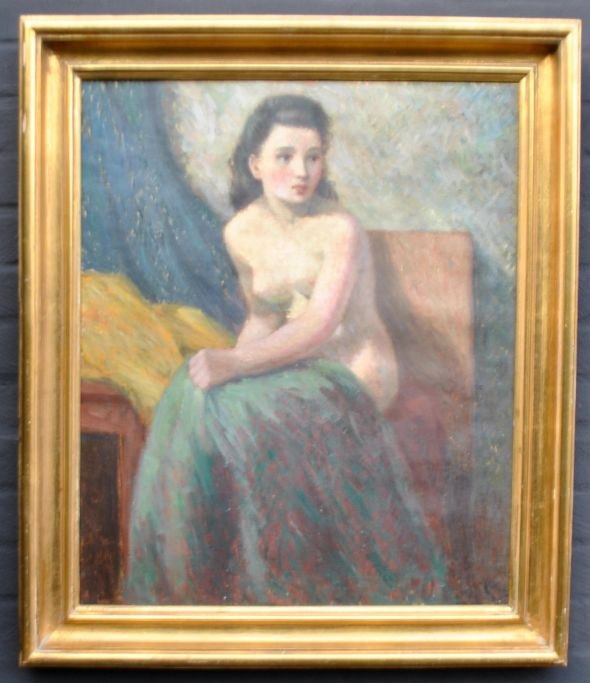 Helme, Helge (1894 - 1987) Danmark: En siddende model. Olie på lærred. Signeret: H. Helge 1945. 65 x 53 cm.