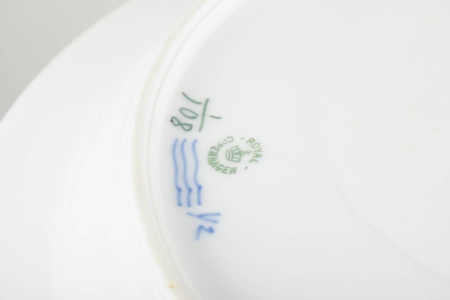 Stort og dekorativt serveringsfad i musselmalet riflet porcelæn, håndmalet i klassisk koboltblå på riflet korpus. Den brede, svungne form og det rige mønster gør fadet til et markant eksempel på Royal Copenhagens produktion i 1920’erne.