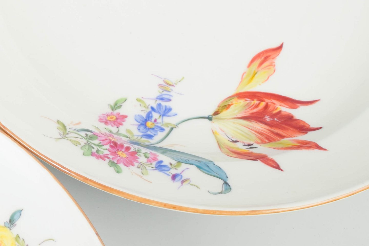 Håndmalede tallerkener i hvidt porcelæn med farverige blomsterdekorationer i klassisk Meissen-stil. Elegant udtryk med let asymmetrisk placering af motiverne.