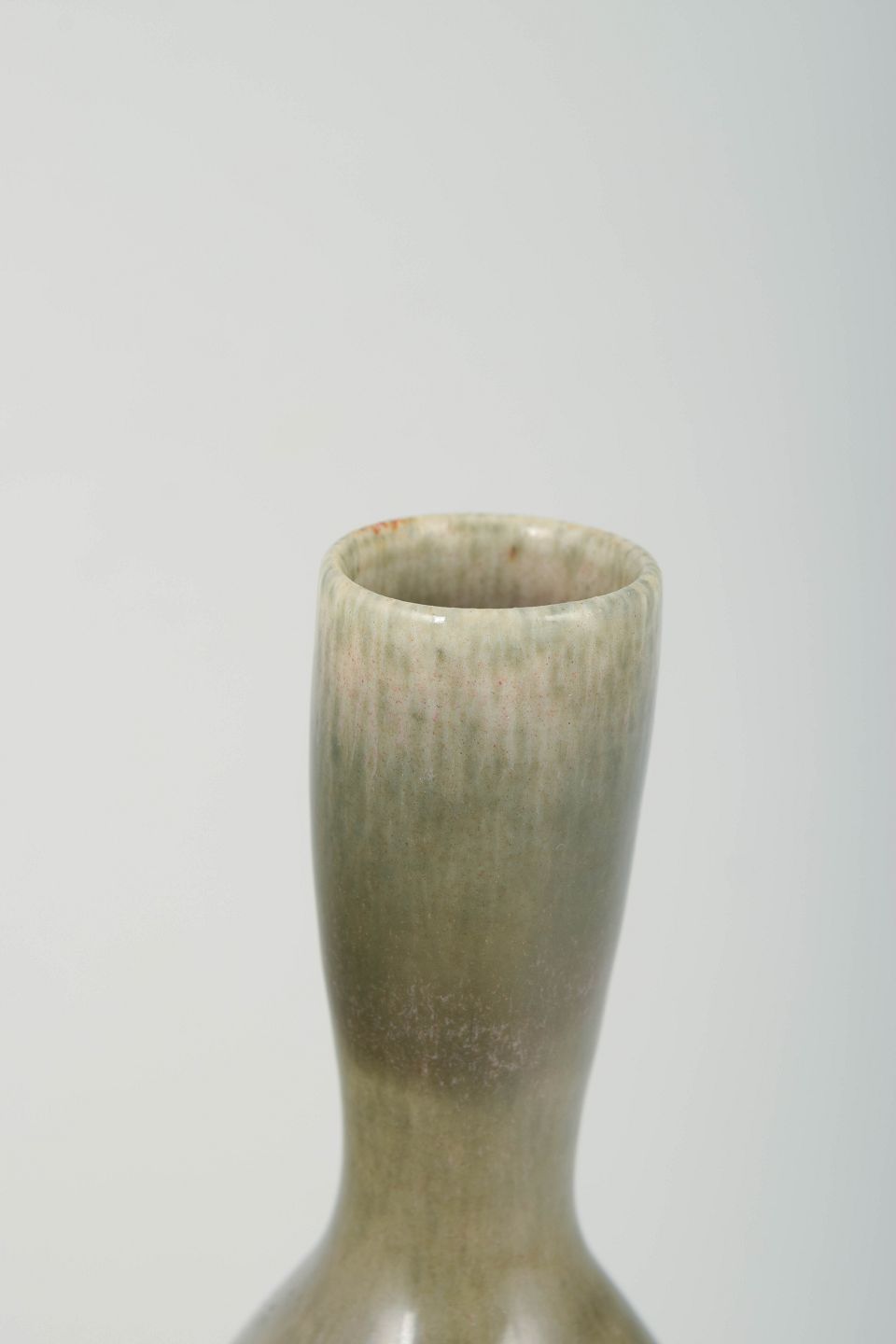 Elegant, hånddrejet stentøjsvase i et slankt, organisk formsprog med karakteristisk harepelsglasur i lyse, jordnære toner. Signeret af keramikeren og udført som et unikt stykke.