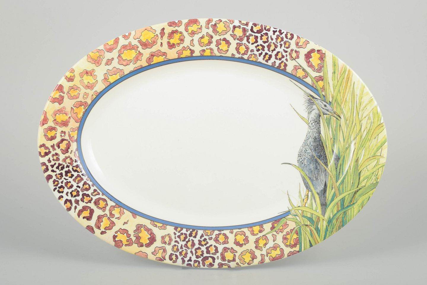 Dekorativt ovalt fajancefad fra Gien i det karakteristiske “Savane”-mønster med farverig bort og naturalistisk motiv. Et markant stykke fra seriens livlige og kunstneriske udtryk.