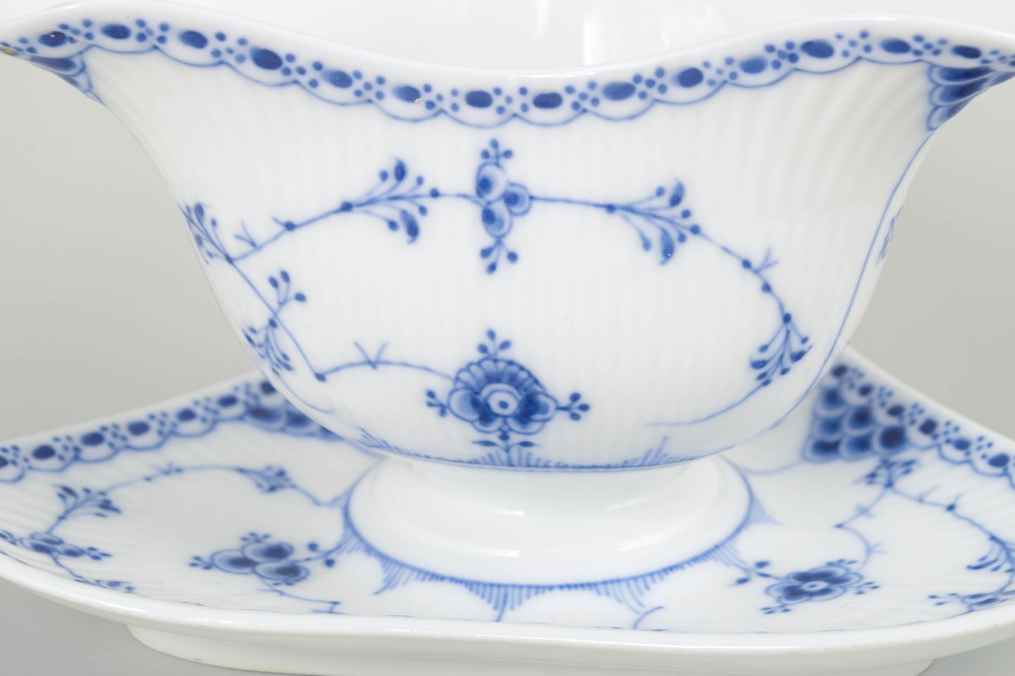 Elegant saucekande, model 1/586, med integreret fad. Klassisk håndmalet dekoration i koboltblå på hvidt porcelæn, udført i Royal Copenhagens tidlige 1900-tals stil. Et smukt eksempel på seriens fine blondedetaljer og organiske formsprog.