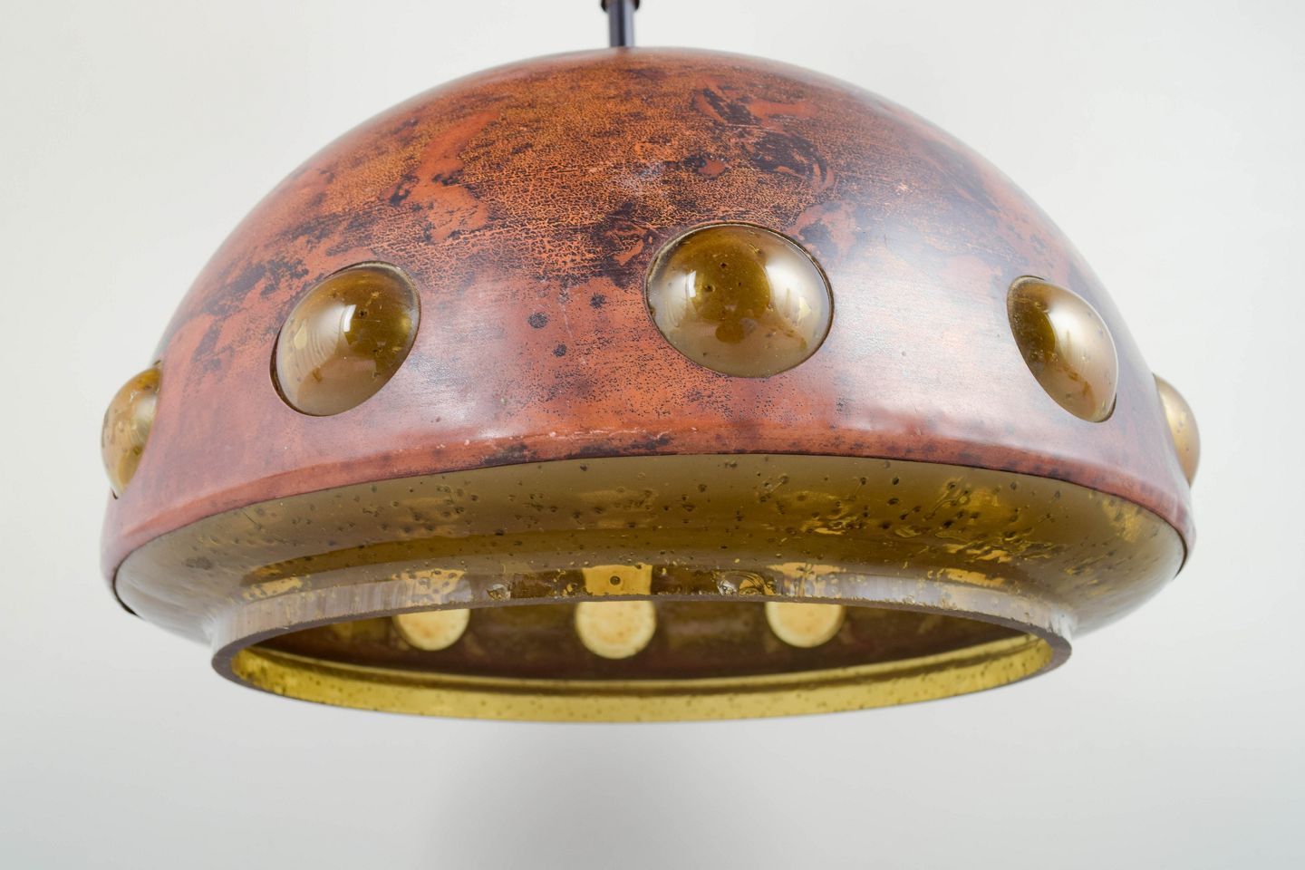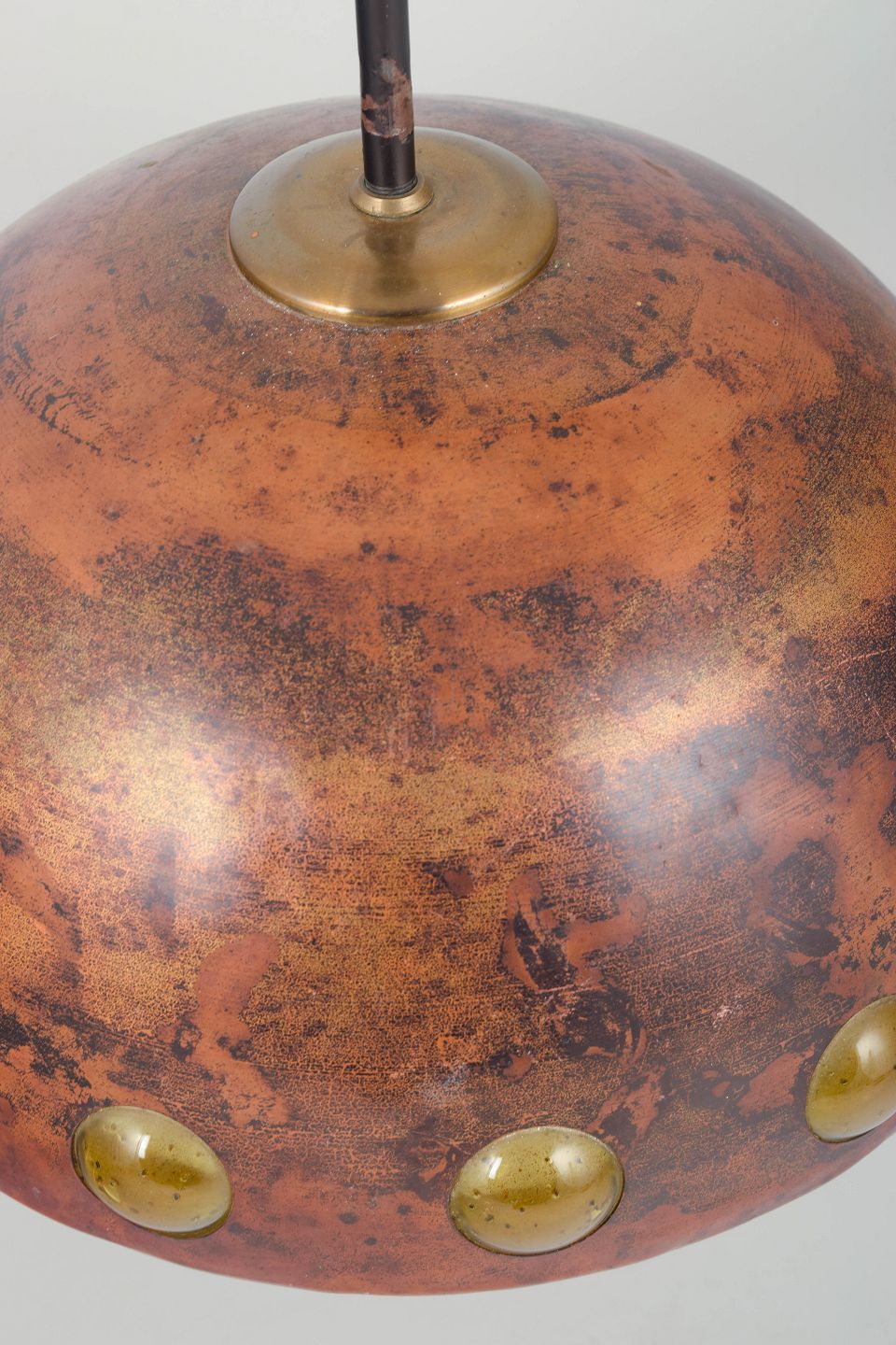 Skulpturel kobberpendel med karakteristisk patineret overflade og indlagte ravfarvede glaslinser rundt om skærmens kant.