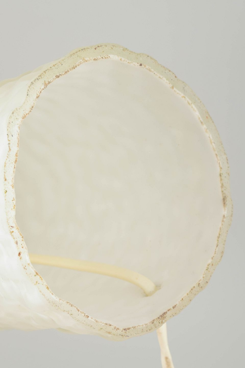 Elegant bordlampe i presset hvidt glas med struktureret overflade og cylinderformet messingtop. Original ledning ca. 2 meter. Et karakteristisk stykke skandinavisk 70’er-belysningsdesign med enkel, men markant materialekontrast.