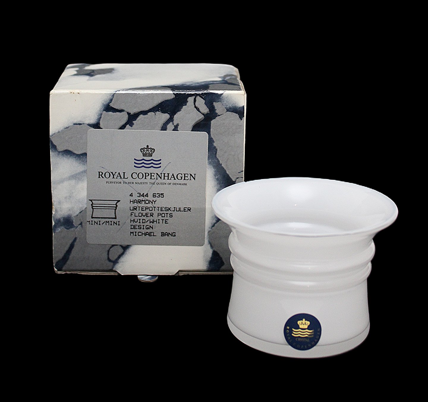 Holmegaard, Harmony, Mini urtepotteskjuler i opaline hvid glas. Designet af Michael Bang i 1989. Urtepotten er til de helt små julestjerner eller andre sæson blomster. Højde 6 cm. Øverste diameter 8 cm. Der er æske til 2 af dem, så de kan bruges til gave. Pris: 275 kr. stk. Lager: 4