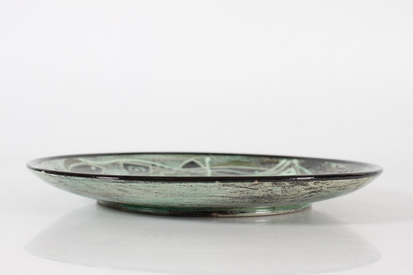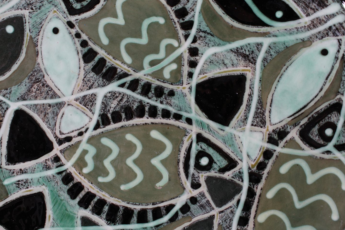 Stort cirkulært keramik fad med fiske dekoration