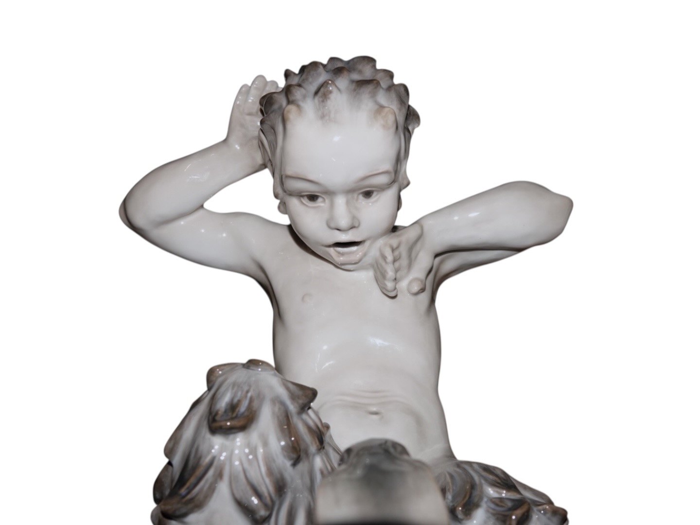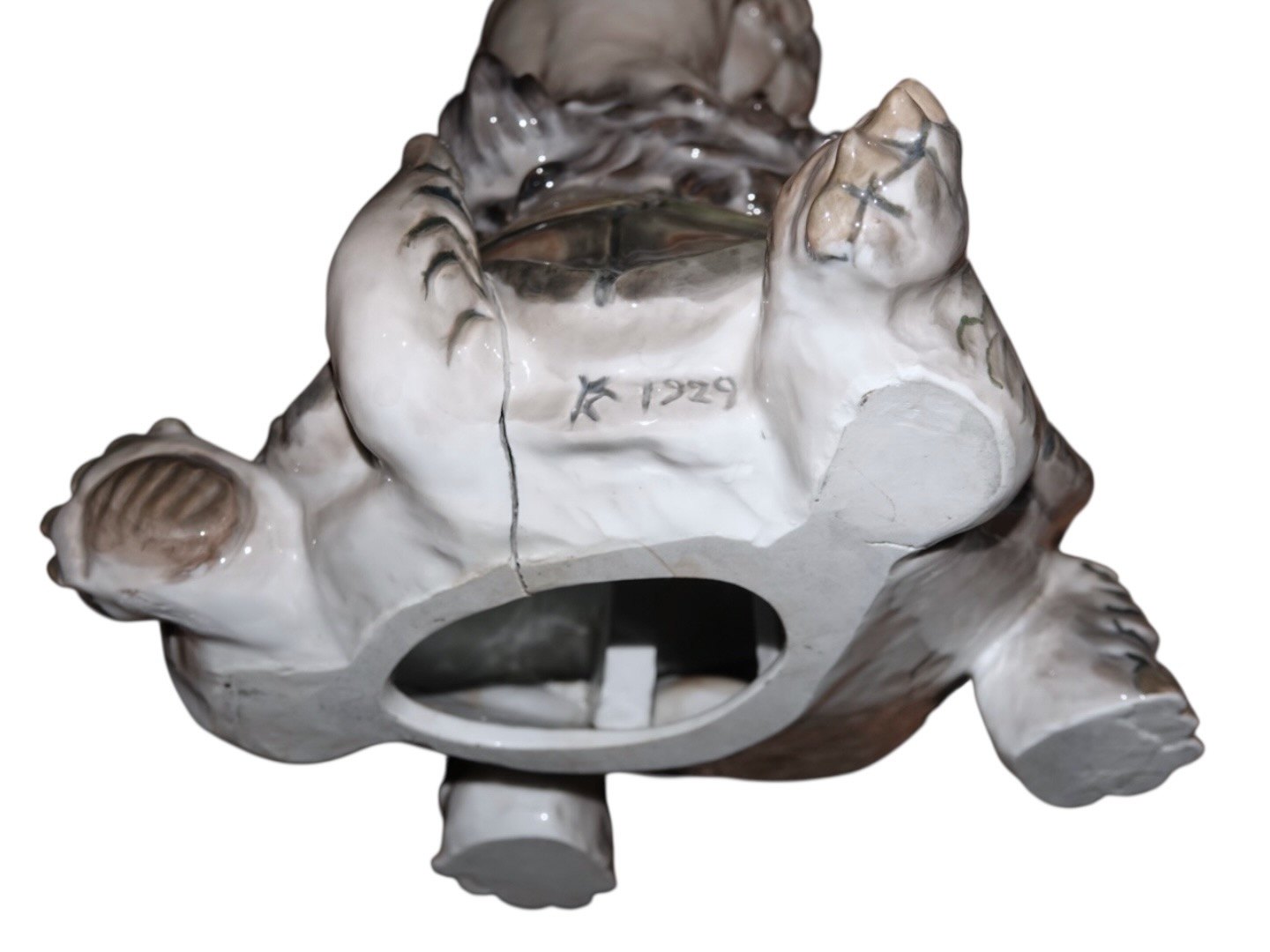 Meget sjælden kæmpe Royal Copenhagen figur, pan (faun) der kæmper med en skildpadde. På det første billede er der en "almindelig" pan figur for at illustrere størrelsesforskellen.