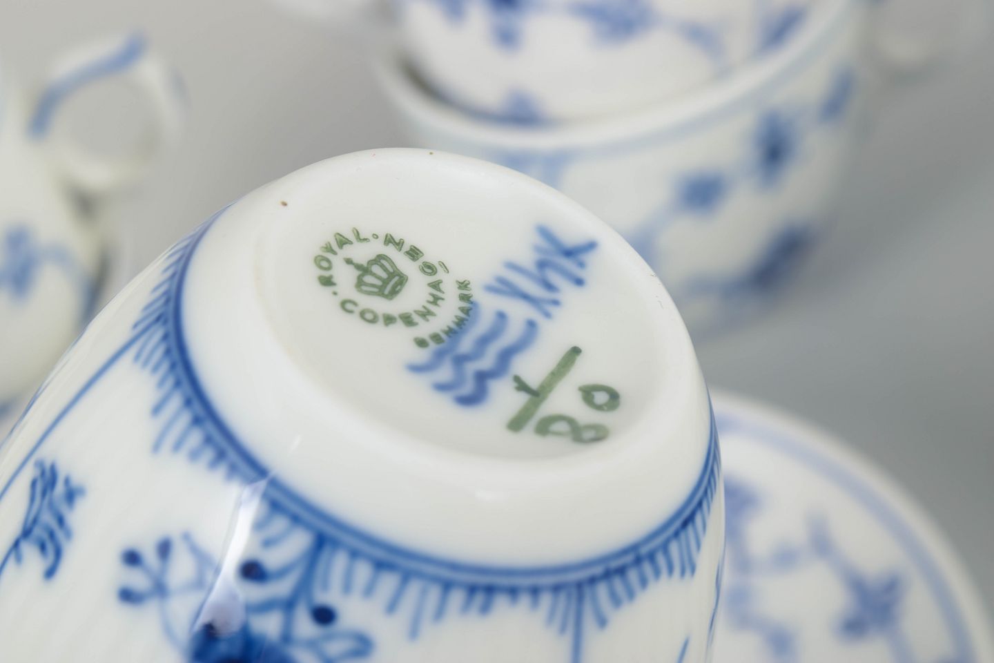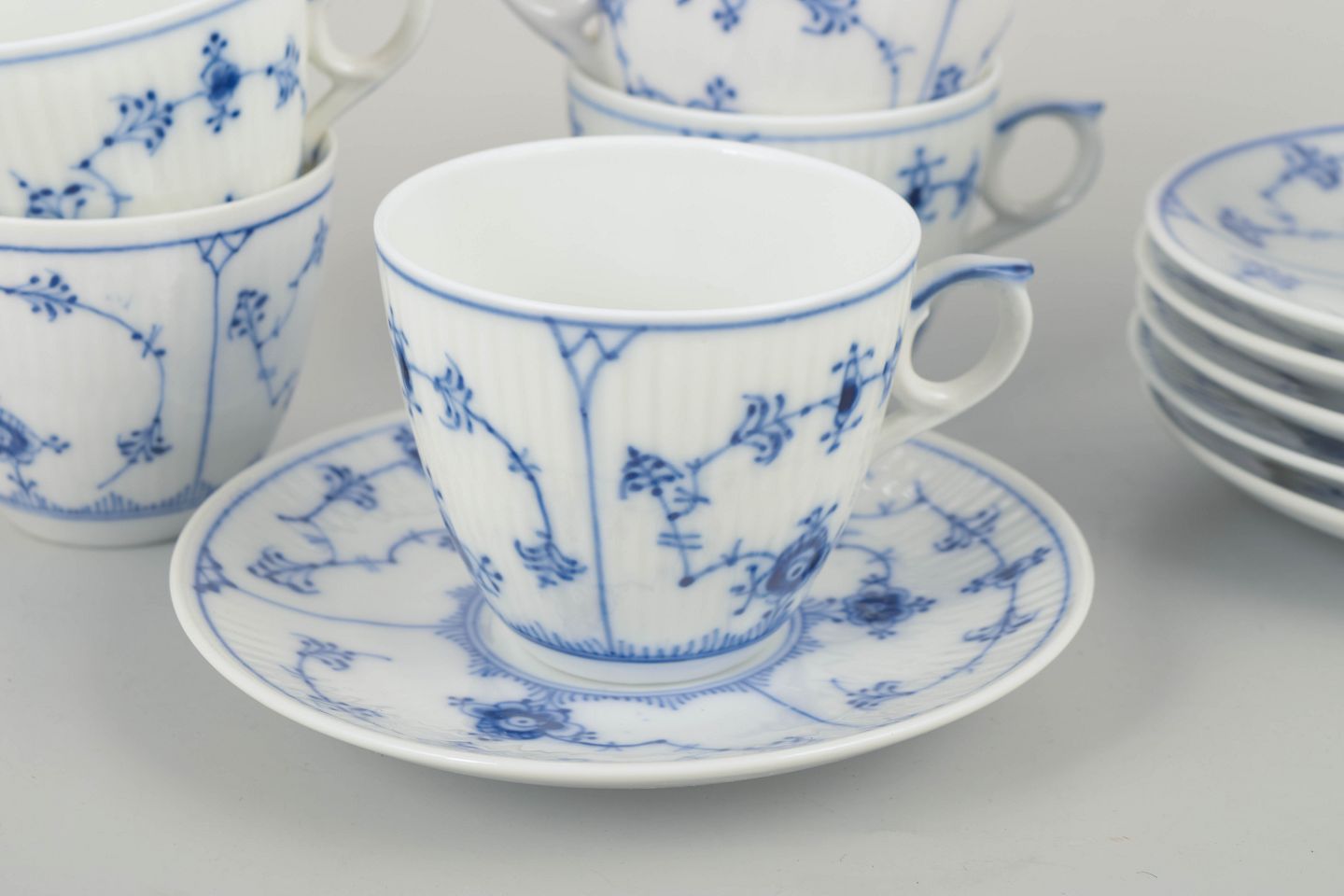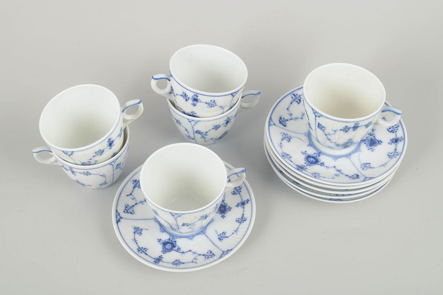 Sæt bestående af seks kaffekopper med tilhørende underkopper i det klassiske Musselmalet Riflet-mønster, model 1/80. Blandede 1. og 2. sortering.