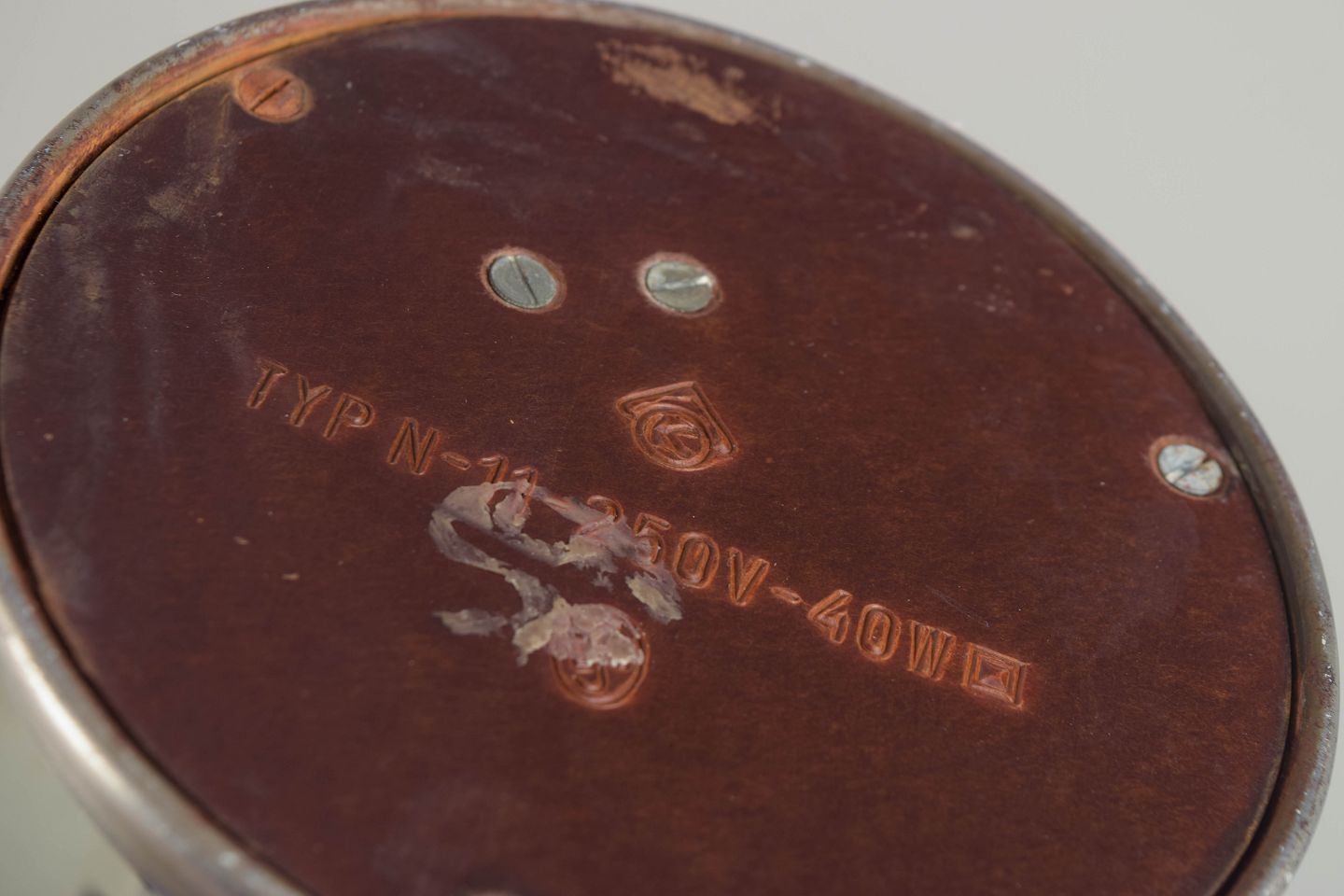 Tidlig modernistisk bordlampe i børstet stål med svampeformet skærm og konisk fod. Et karakteristisk eksempel på tjekkisk funktionalistisk belysningsdesign fra mellemkrigstiden, hvor rene linjer og industrielle materialer dominerede.