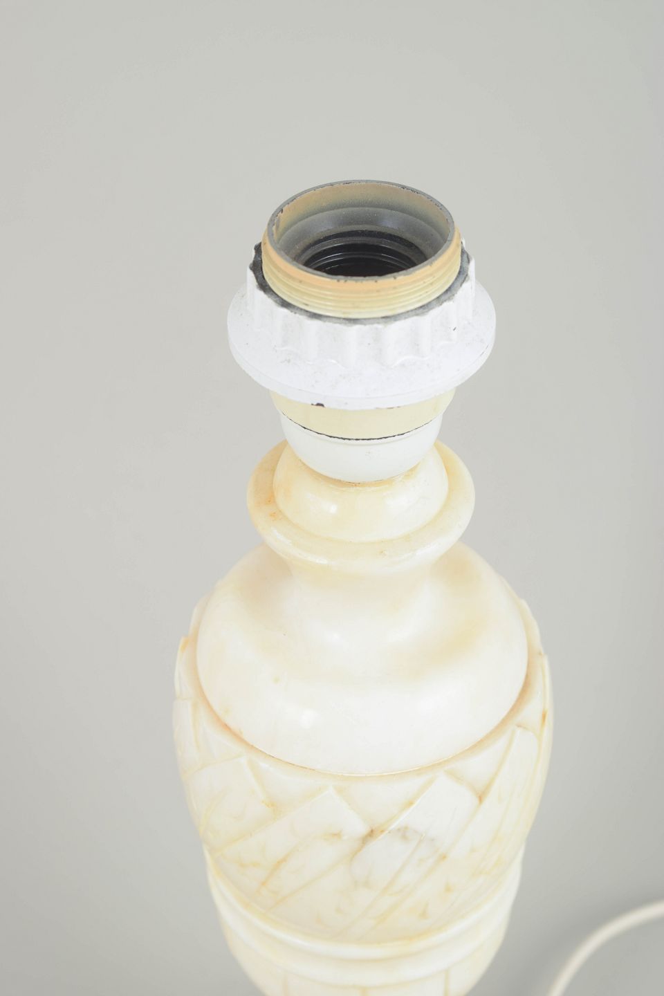 Dekorativ bordlampe i lys marmor med udskårne diamant- og lodrette facetmønstre, der giver lampen et klassisk og elegant formsprog. Den kvadratiske fod og de bløde proportioner understreger lampens skulpturelle karakter.