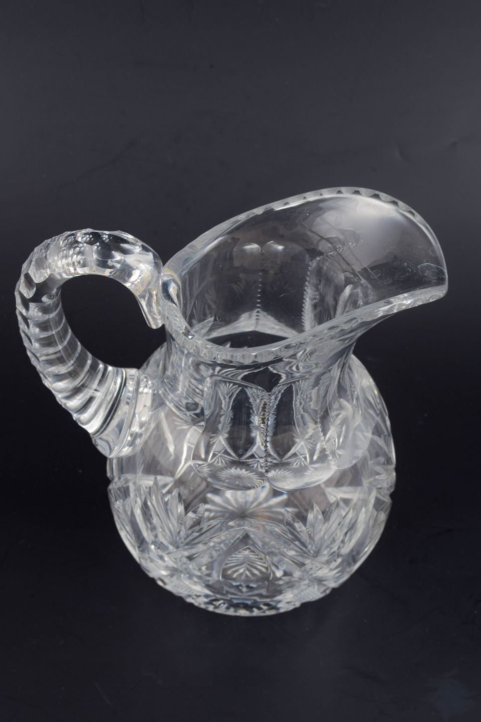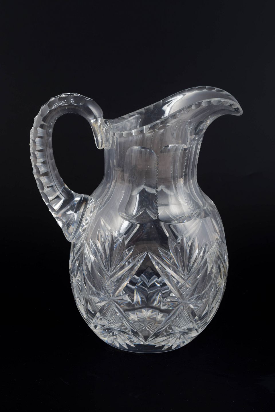 Elegant og solid kande i klart krystalglas med dybe slibninger i form af stjerne- og bladmotiver. Det tunge materiale og den markante dekoration giver kanden et klassisk, tidstypisk udtryk fra mellemkrigstiden.