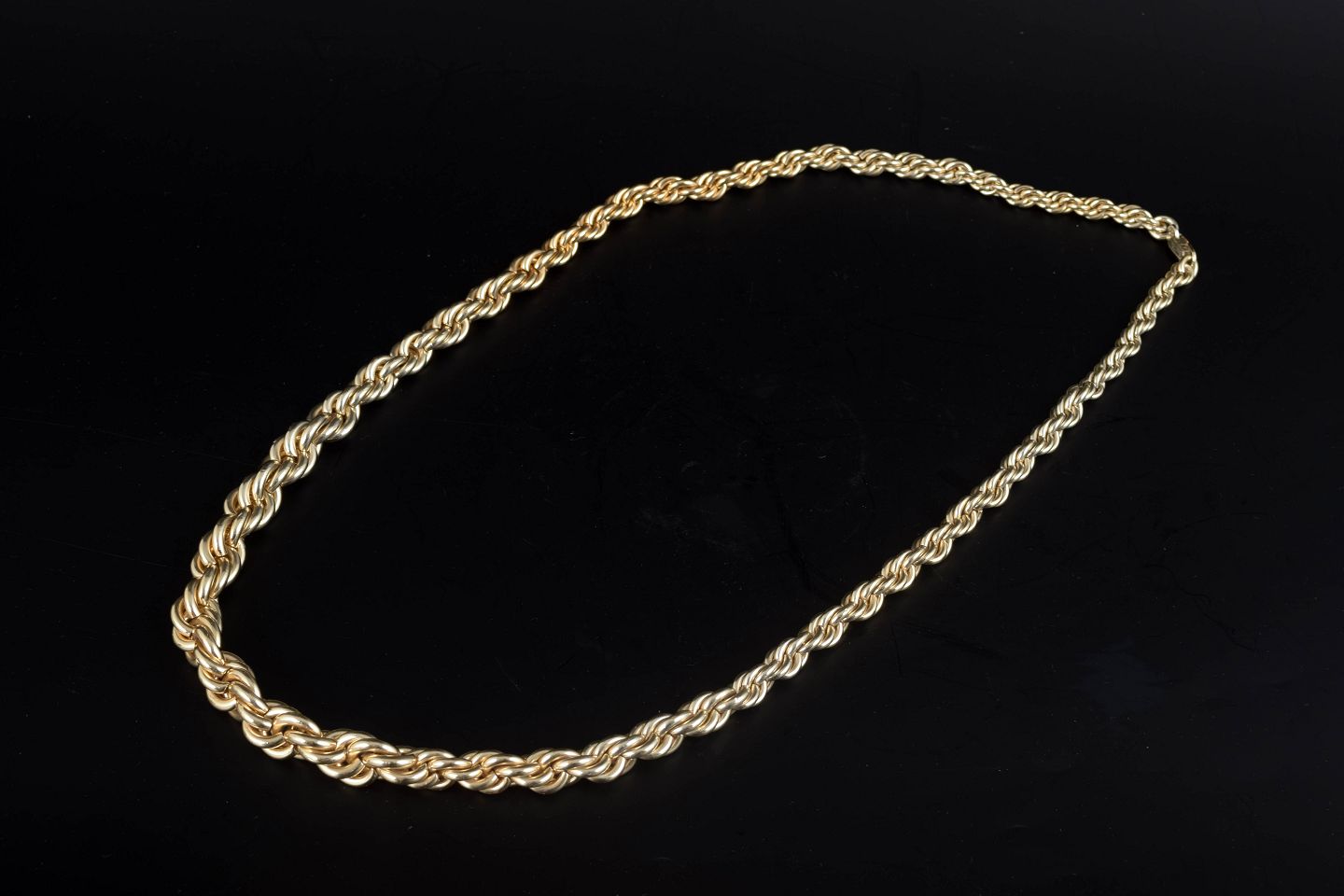 Elegant, heavy twisted chain in gilt metal, executed in Dior’s signature 1970s style. A bold and luxurious piece with a warm glow and strong period character. Length approx. 85 cm.