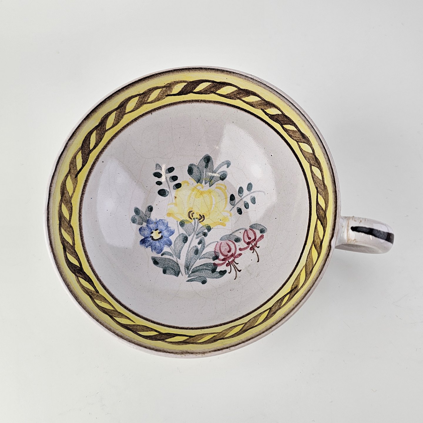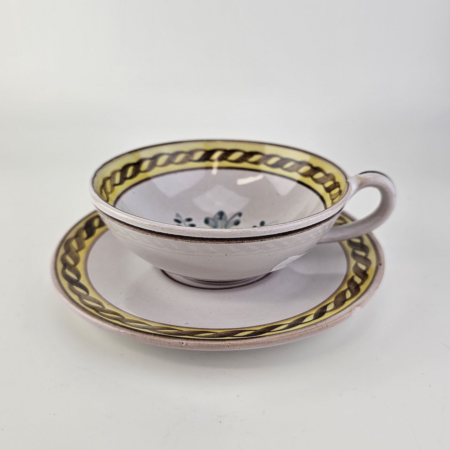 Kop og underkop i keramik med gule detaljer og blomsterdekoration