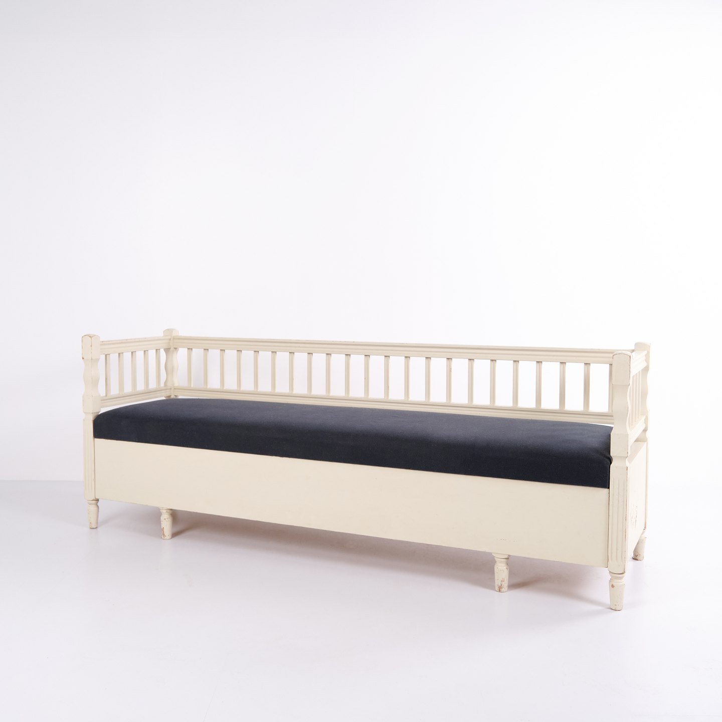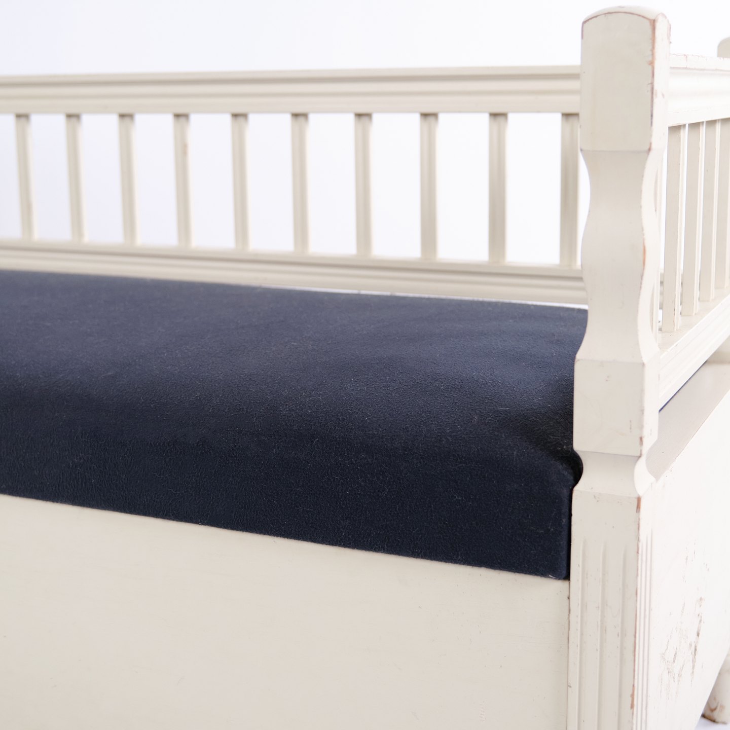 Antik slagbænk i gustaviansk stil fra ca. 1890. Hvidmalet med polstret sæde. Klassisk møbel med patina og charme.