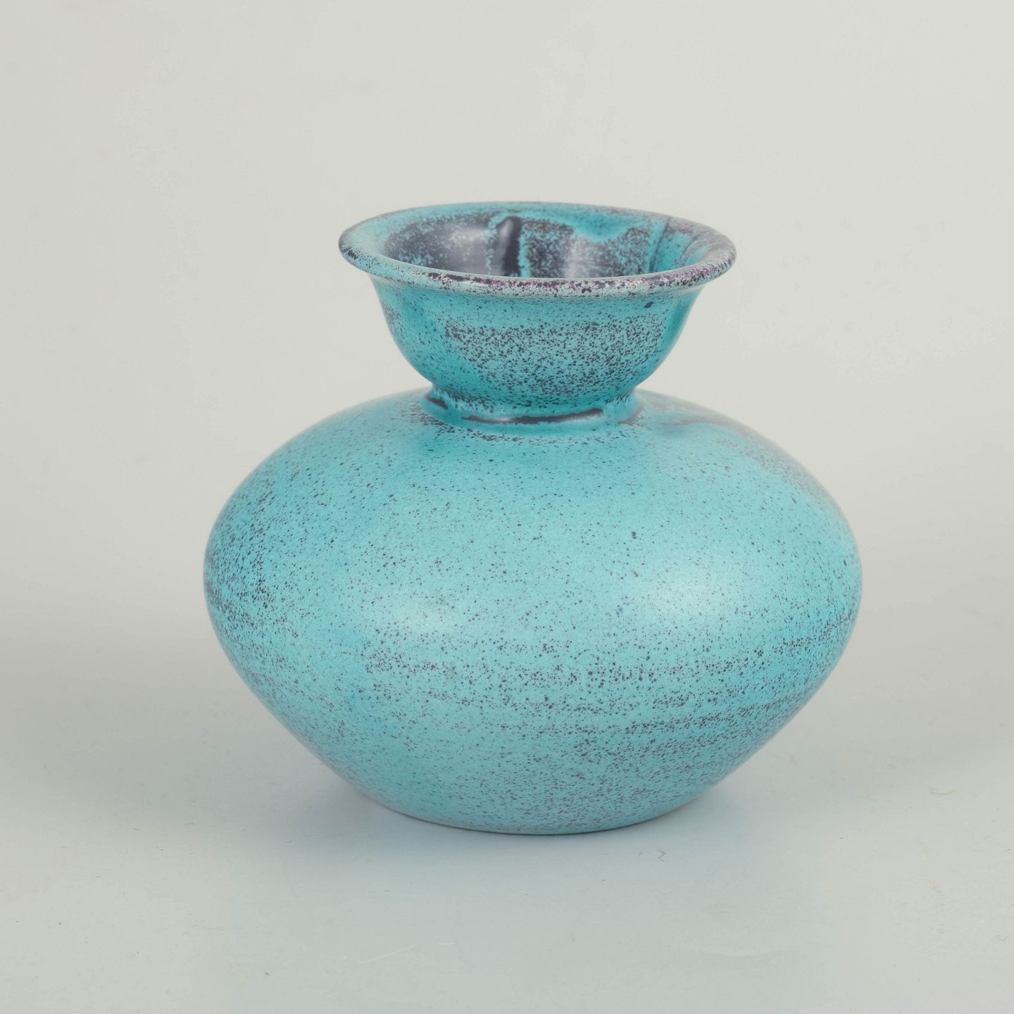 Compact, baluster-shaped stoneware vase with a narrow, slightly flaring neck. Finished in a clear turquoise glaze with a fine, lively surface and subtle darker nuances around the rim. The calm, well-balanced form reflects Svend Hammershøi’s characteristic focus on proportion, volume, and the material presence of the glaze.