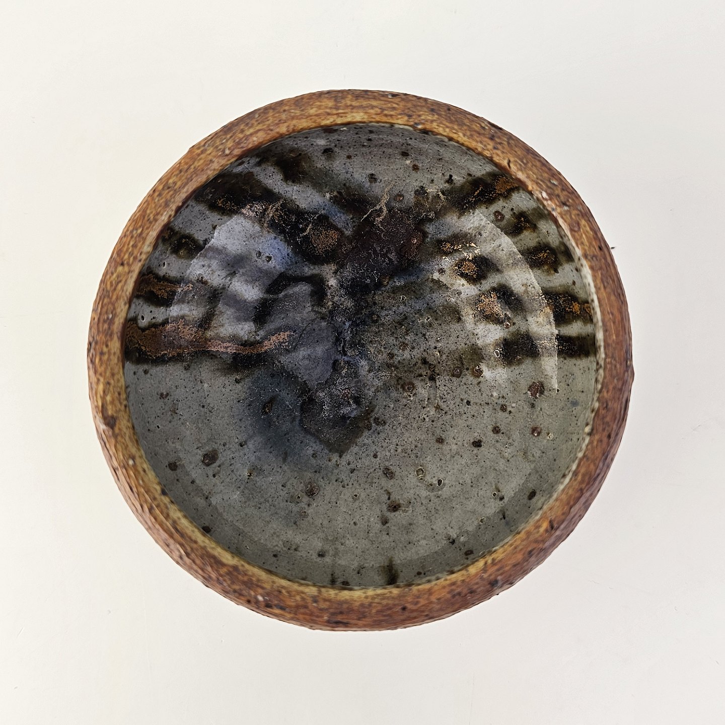 Lille keramik skål der er uglasseret udvendigt, og stribet mønster indvendigt