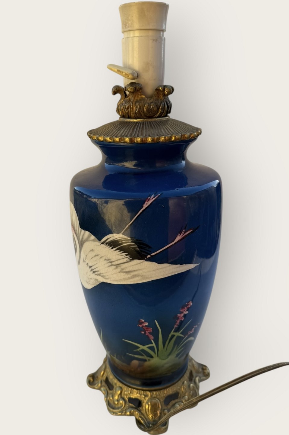 Stor bordlampe med flyvende fugl i porcelæn og messing, højde med fatning 39cm *Enkelte småkrakeleringer under glasuren (se foto) ellers flot stand