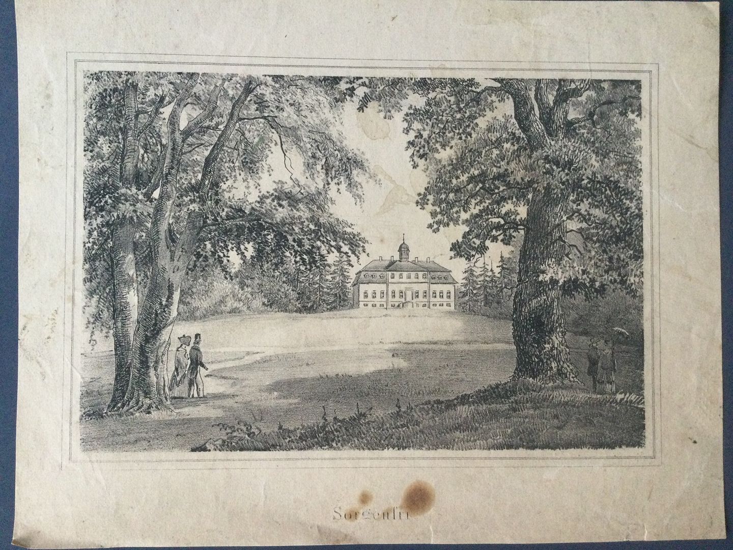 Tryk efter kobberstik af Jens Holm efter tegning af H.G.F. Holm - Sorgenfri Slot ca. 1840.