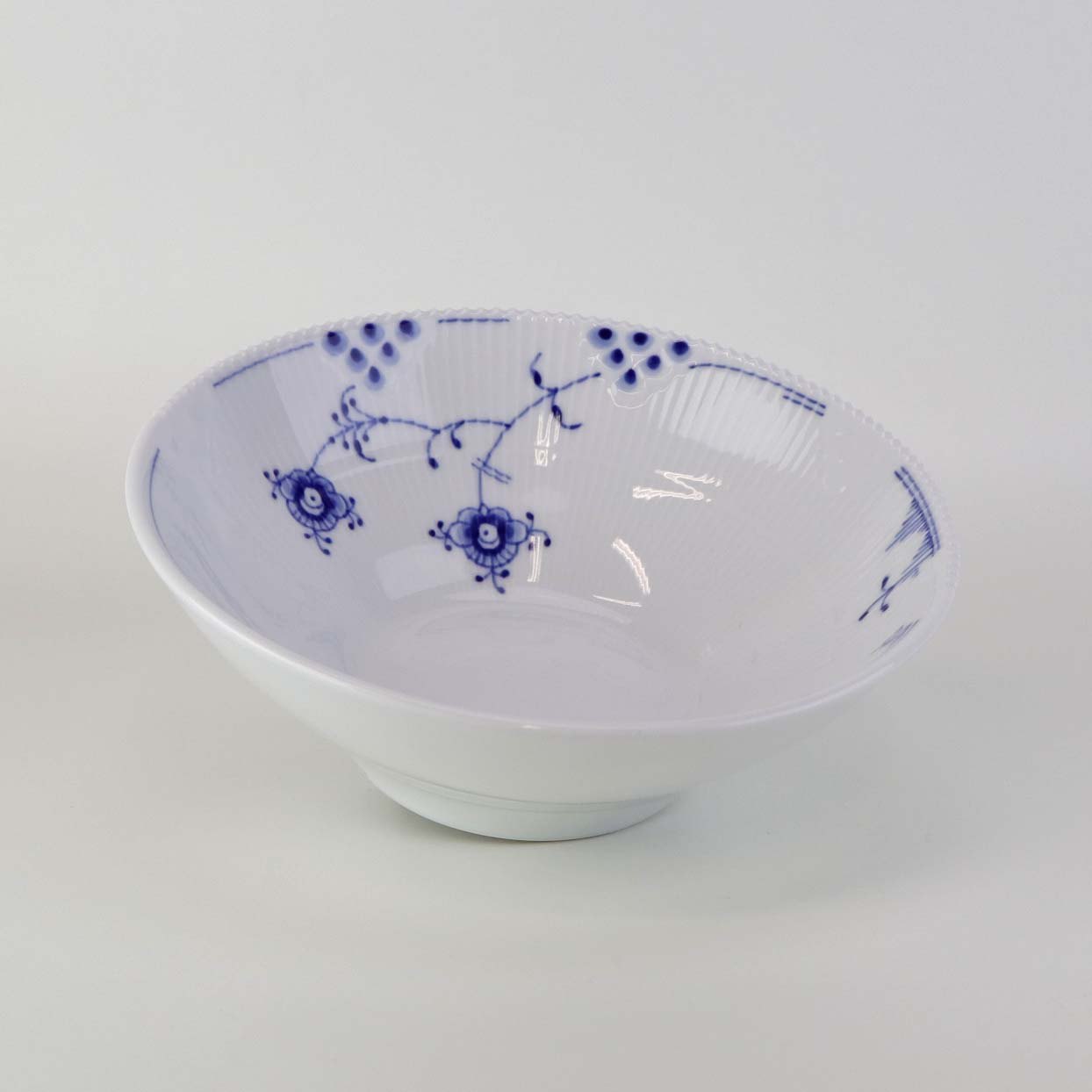 Service i glat porcelæn med let riflet kant og blå dekoration