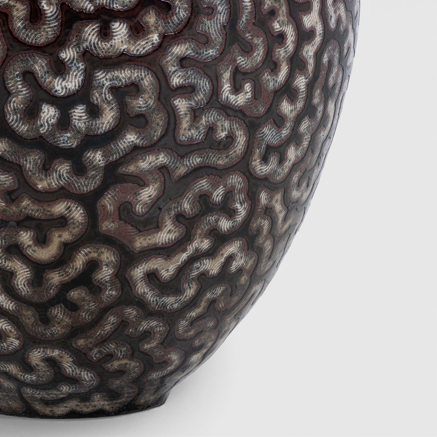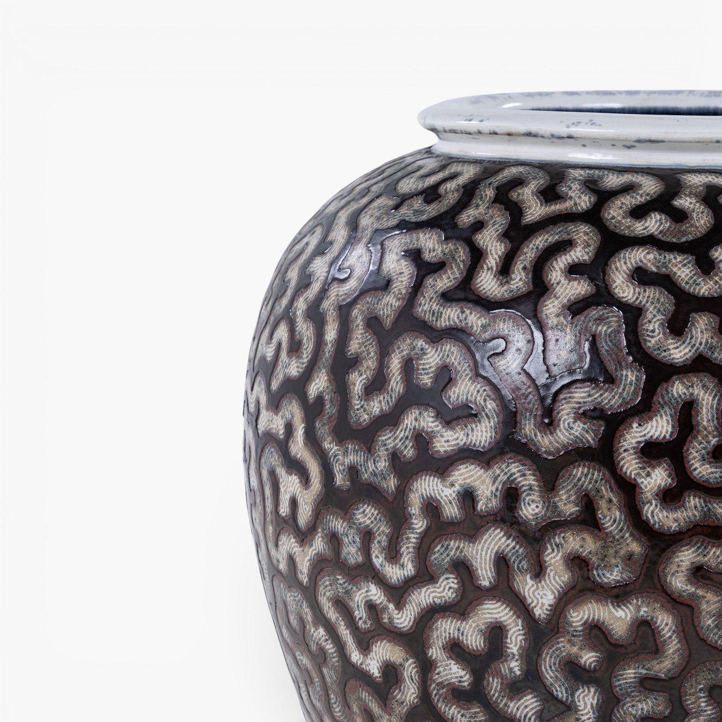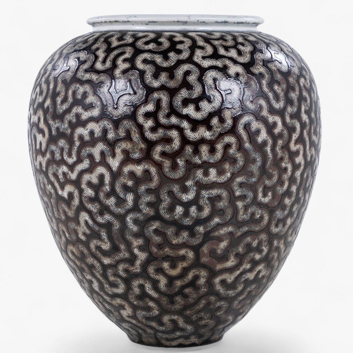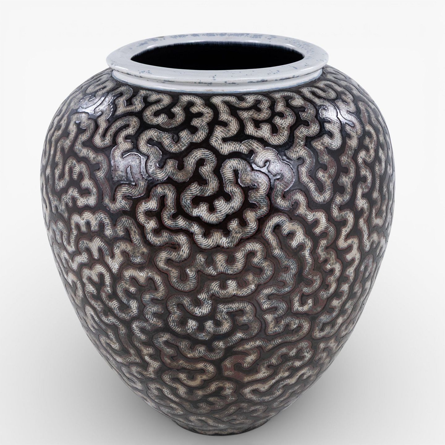 Kolossal krukke i stentøj med sort glasur og hvide stafferinger. Signeret.