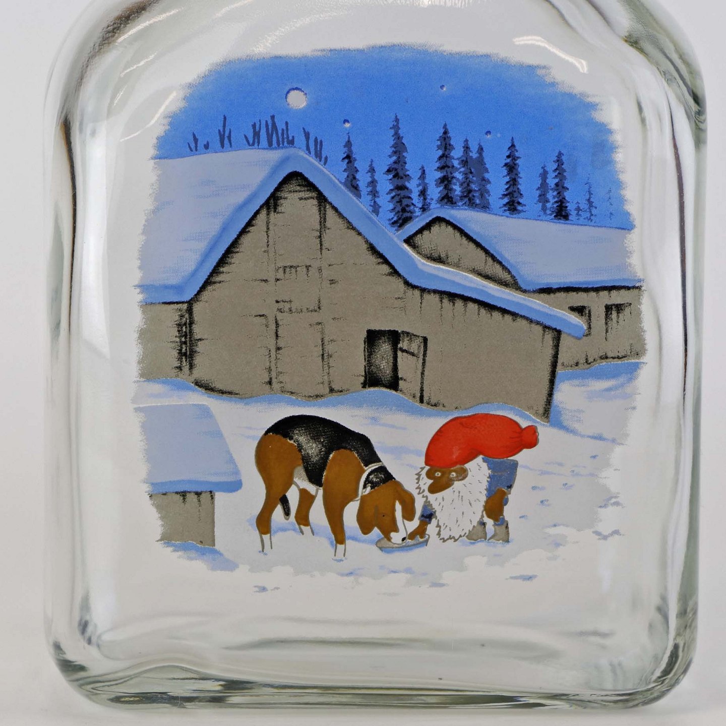 Dramflaske i glas med julemotiv af Nisse, hund og ræv efter tegning af Harald Wibergs. Snapseflasken kommer med korkprop.