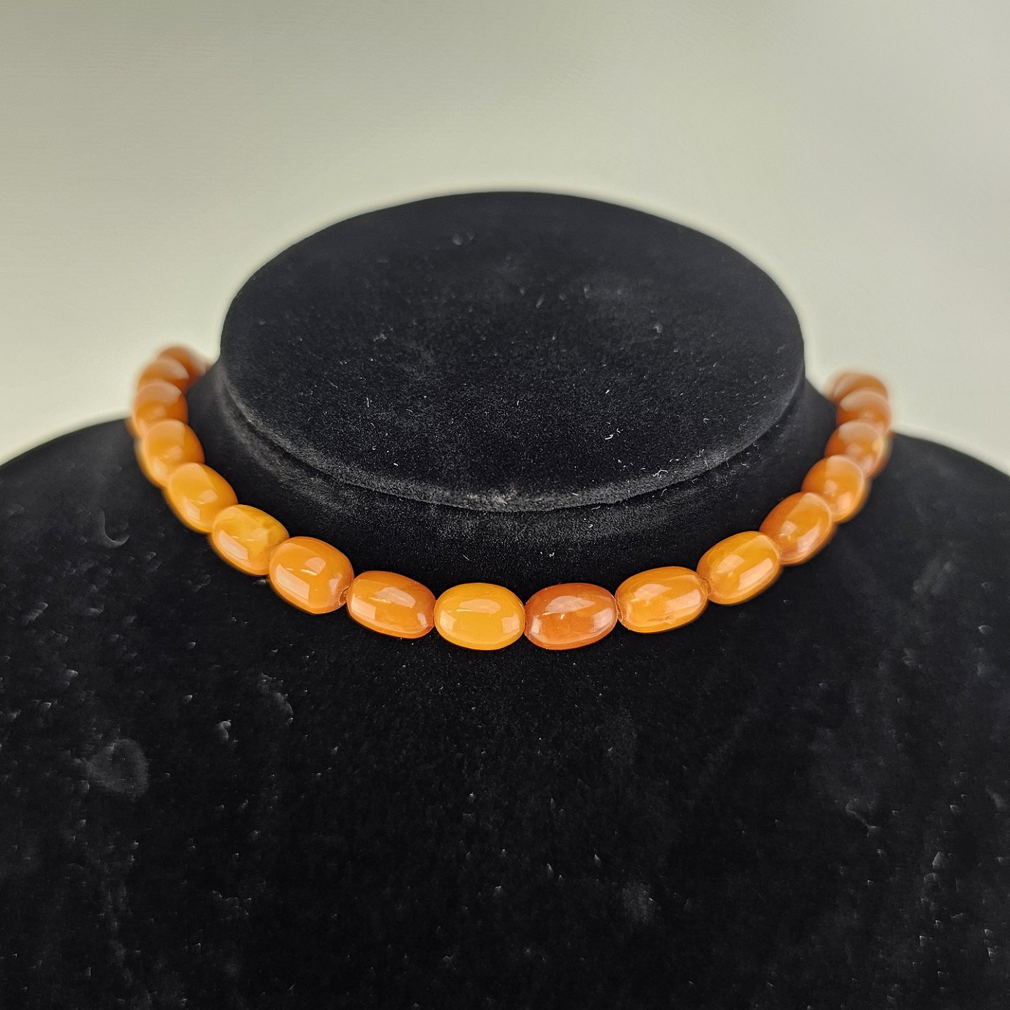 Halskæde med perler af glatslebet rav i varierende størrelse på snor, i alt 54 stykker rav