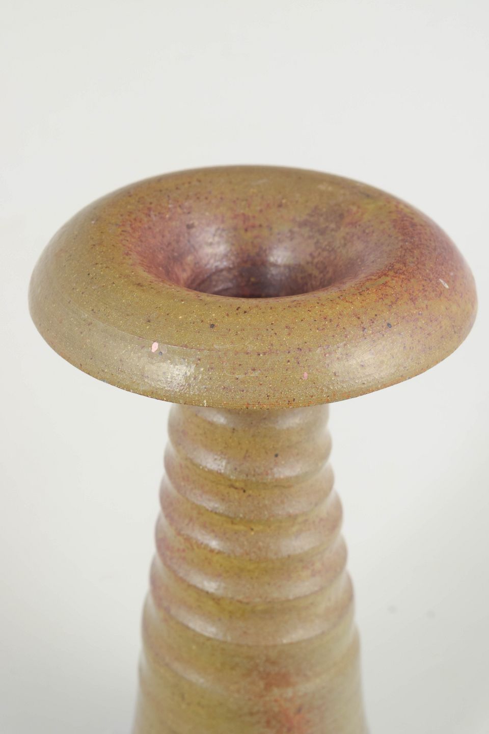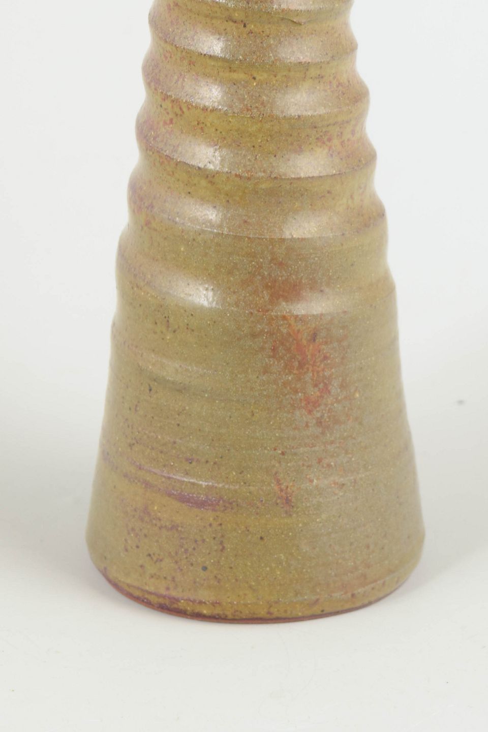Slank og skulpturel vase udført i stentøj med mat, sandfarvet glasur og diskrete variationer i overfladen. Den profilerede krop med horisontale riller giver et arkitektonisk og balanceret udtryk. Signeret med monogram i bunden.