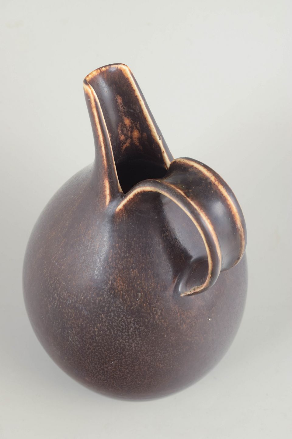 Sjælden og stor spaltekande i stentøj med karakteristisk organisk, pæreformet krop, markant tud og integreret hank. Udført med Saxbos klassiske matte til let skinnende glasur i dybe brunlige toner med subtilt farvespil. Formen fremstår skulpturel og velafbalanceret og repræsenterer Saxbos mest eftertragtede udtryk.