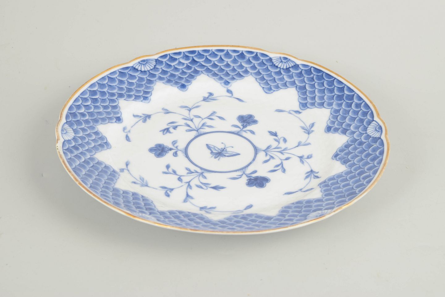 Antik rund porcelænstallerken dekoreret med blå underglasur i det klassiske Sommerfugl-mønster. Dekorationen er centreret omkring en medaljon med sommerfugl og florale ranker, omgivet af den karakteristiske skællede rand og afsluttet med håndpålagt guldkant. En sjælden og tidlig tallerken fra Bing & Grøndahls produktion i slutningen af det 19. århundrede.