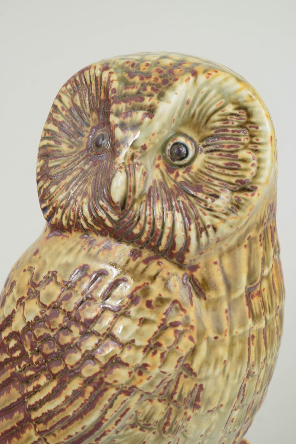Naturalistisk uglefigur i stentøj med detaljeret relief og levende, flerfarvet glasur i jordnære nuancer. En karakterfuld skulpturel form med tydelig reference til naturmotiver, udført i et robust og dekorativt udtryk.