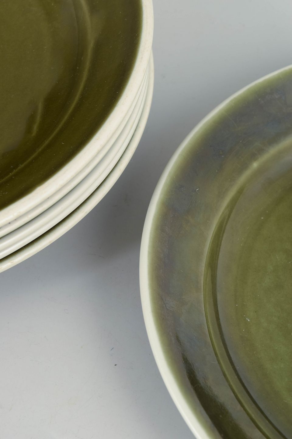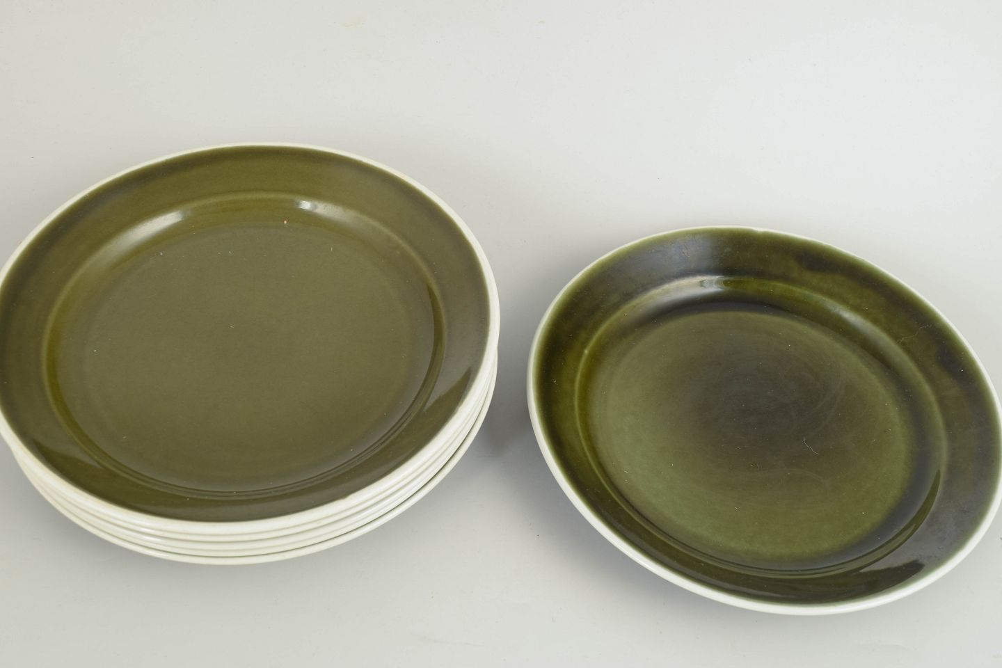 Sæt bestående af seks middagstallerkener i stentøj fra Vardag-serien med karakteristisk grøn glasur. Enkle og funktionelle former skabt til hverdagsbrug med et klart skandinavisk modernistisk udtryk.