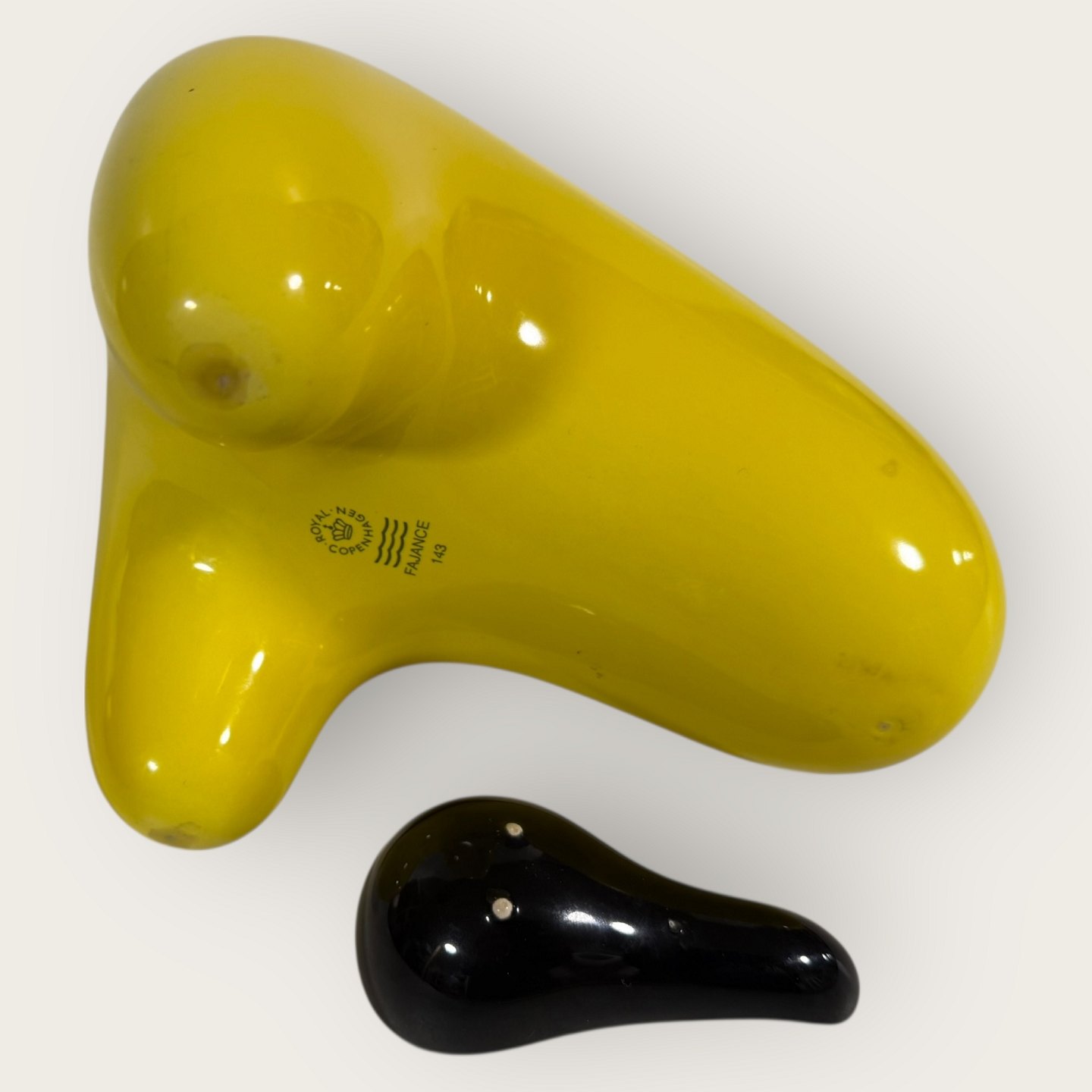 Royal Copenhagen, Fajance, gul kande med sort låg, # 143, Design Ole Jensen, låget fungerer også som måleske, Mål: ca. 20x19x15cm, 1. sortering *Perfekt stand*