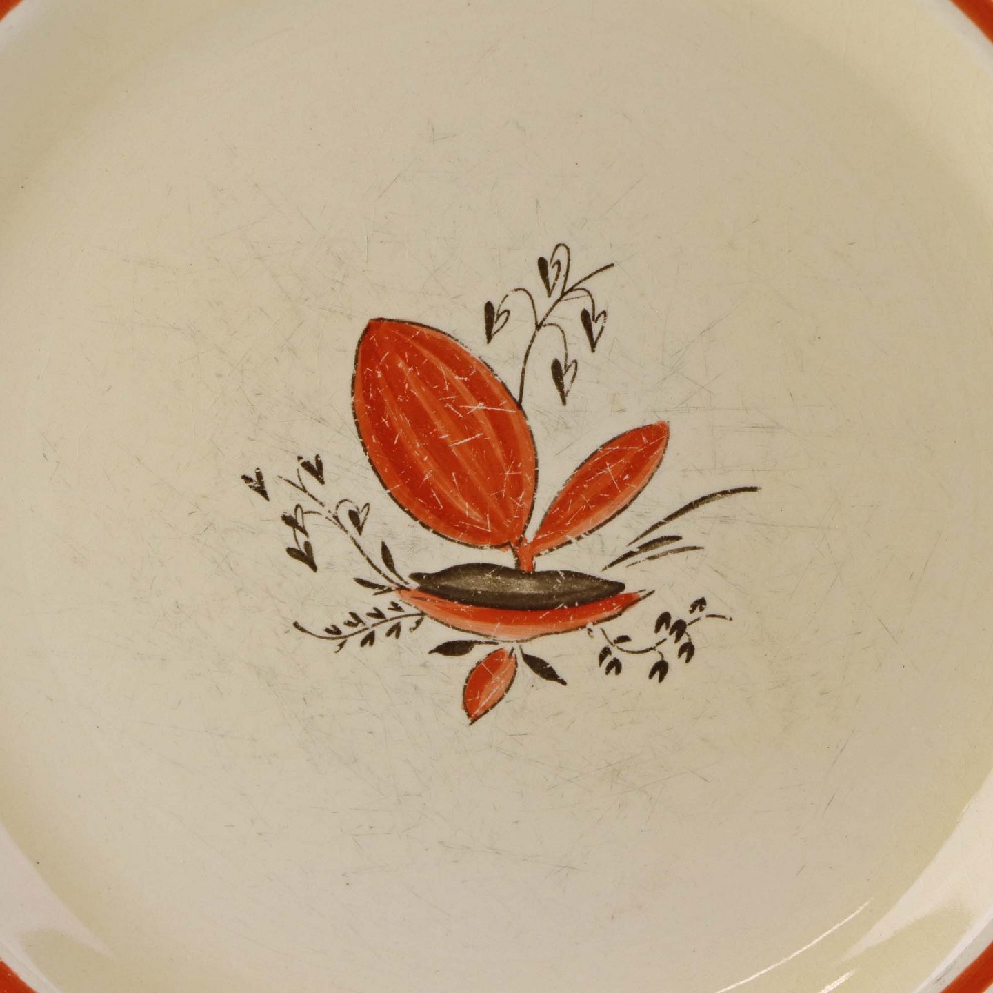 Fajancestel i stelform E med orangerød og brunt dekoration på gul baggrund og med orangerød kant.