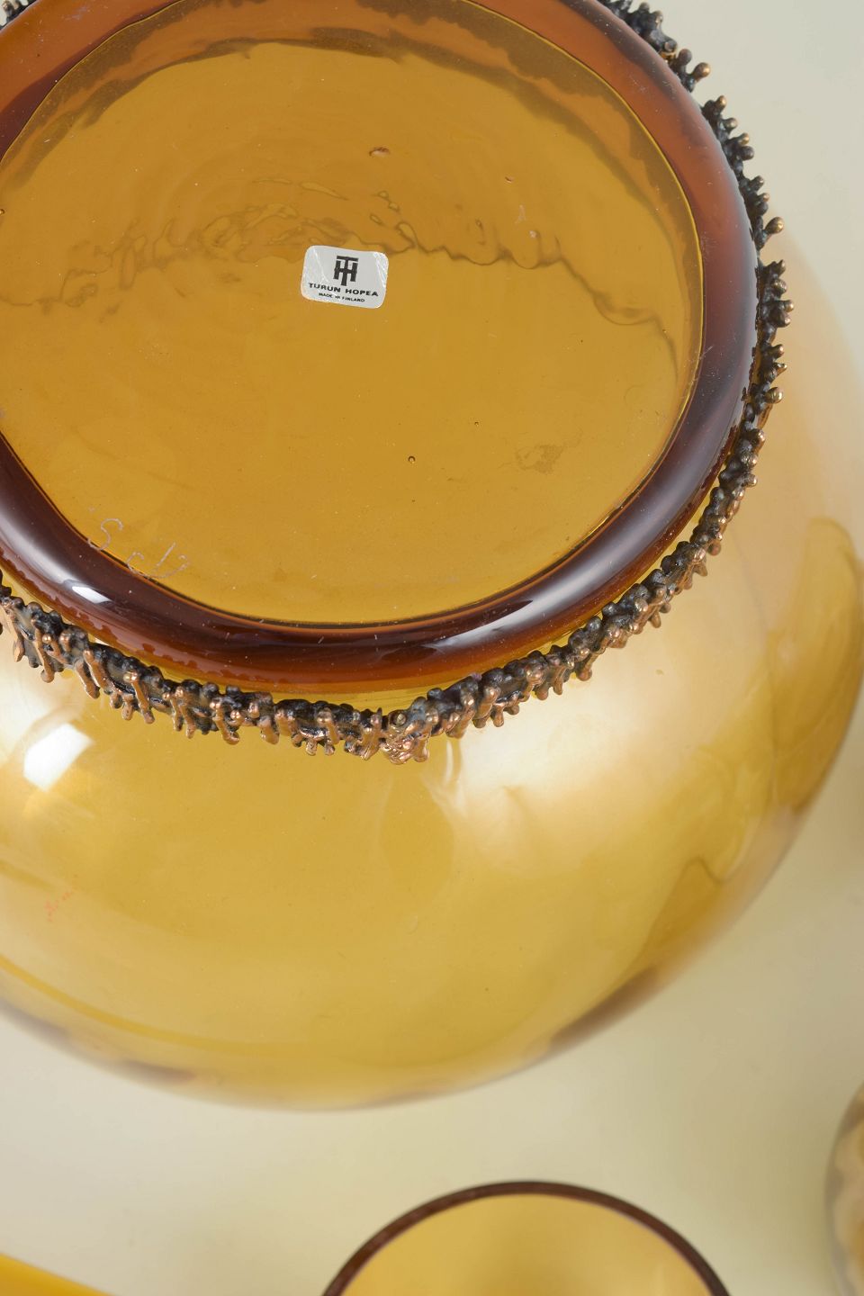 Punch bowl set in amber-toned mouth-blown art glass with a distinctive metal base, comprising a large punch bowl, 6 glasses, and a matching ladle. The sculptural design is defined by the contrast between the warm glass and the raw, textured metal foot.