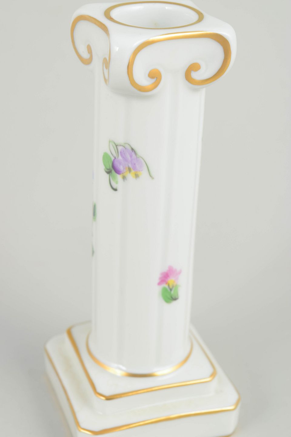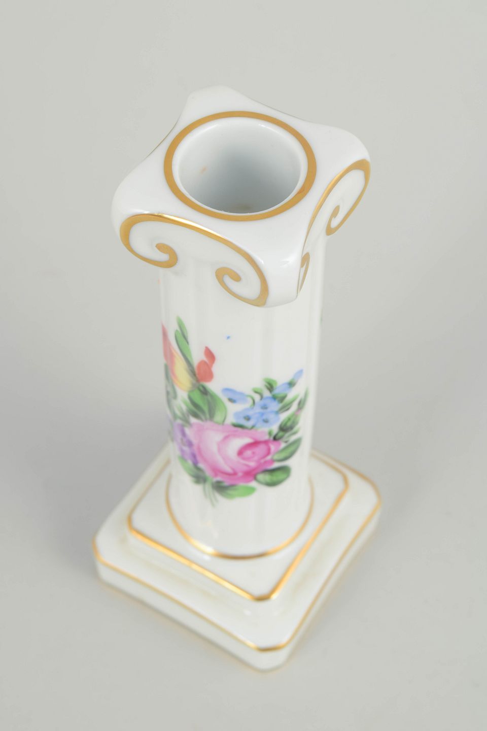 Hand-painted candlestick in glazed porcelain with floral decoration in pink, purple, blue and green tones. Slender baluster-shaped column on a square base with moulded details and subtle gilt accents along the edges and ornamentation.