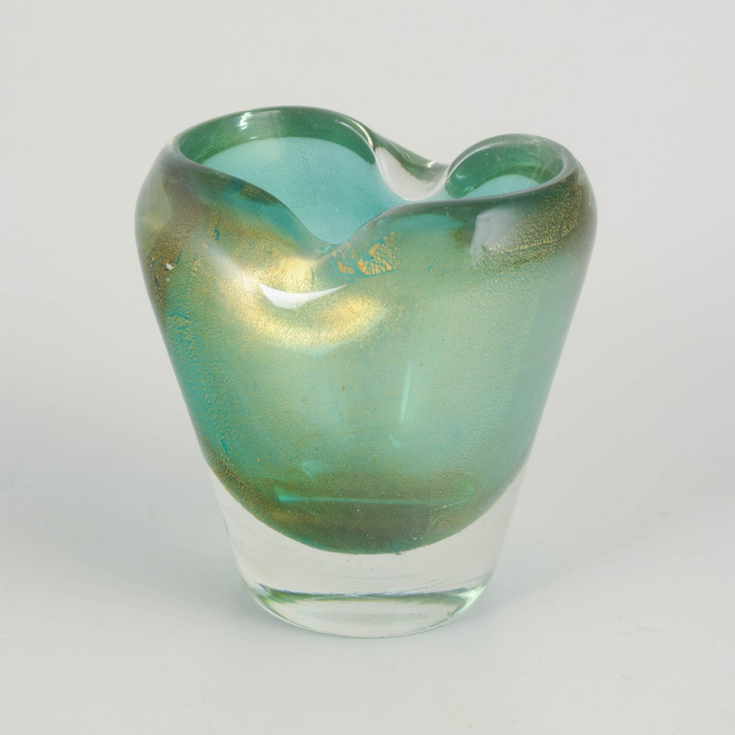 Skulpturel vase i mundblæst kunstglas med fri, organisk åbning og let asymmetrisk kant. Glasset fremstår i klare turkisgrønne nuancer med gyldne indeslutninger, der giver dybde og et blødt, levende farvespil. Den massive, klare fod danner en stabil base og kontrasterer elegant mod den farvede overdel. Formen og materialebehandlingen er karakteristisk for muranesisk kunstglas fra midten af det 20. århundrede.