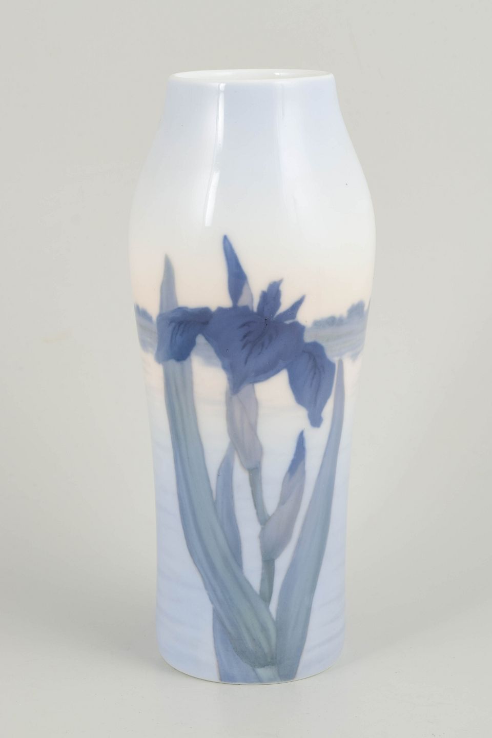 Høj, let facetteret vase i glaseret porcelæn med håndmalet underglasurdekoration af irisblomster i dybe blå nuancer med grønne stilke, udført mod en lys, let tonet bund. Dekorationen er elegant strakt langs vasens lodrette form og afspejler Royal Copenhagens naturalistiske formsprog i 1920’erne.