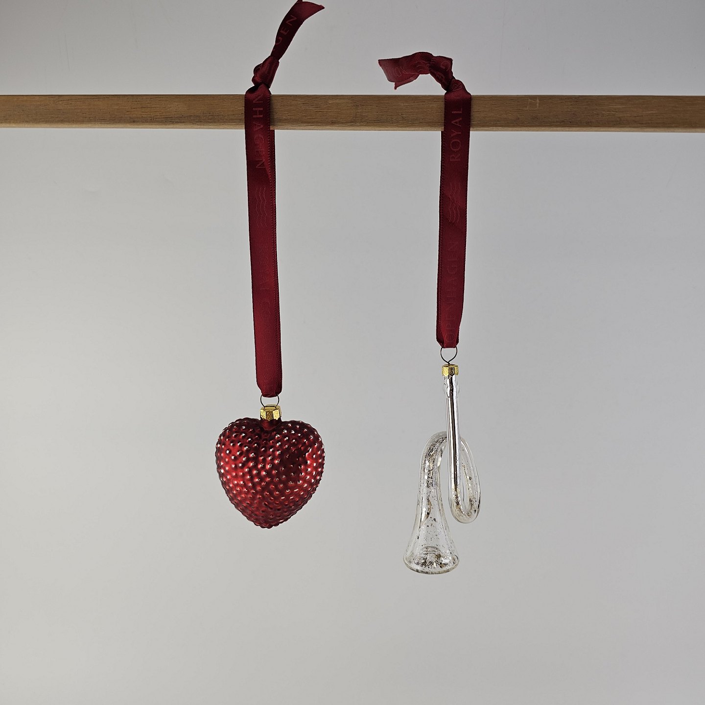 Juleornamenter i glas med motiv af et hjerte og en trompet med rødt bånd til ophæng