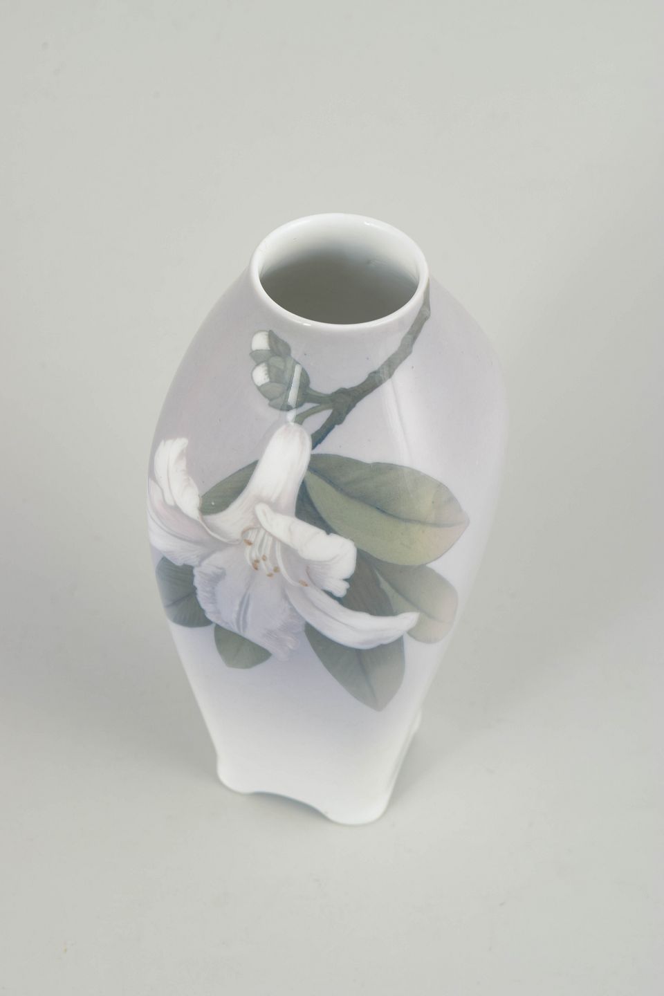 Vase i glaseret porcelæn med håndmalet underglasurdekoration i Art Nouveau-stil med blomstrende grene og blade i bløde, afdæmpede nuancer over en let tonet bund. Model 846/240.