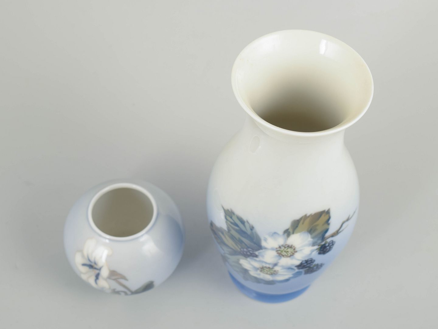 Royal Copenhagen arbejdede gennem både 1920’erne og 1960’erne med dekorative vaser, hvor klassiske former blev kombineret med håndmalede blomster- og plantemotiver i underglasur. 1920’ernes produktion er ofte præget af bløde overgange og et mere kunstnerisk, malerisk udtryk, mens 1960’erne viser et renere formsprog med tydeligere farveopdelinger. Begge perioder vidner om fabrikkens høje håndværksmæssige niveau og lange tradition for porcelænskunst.