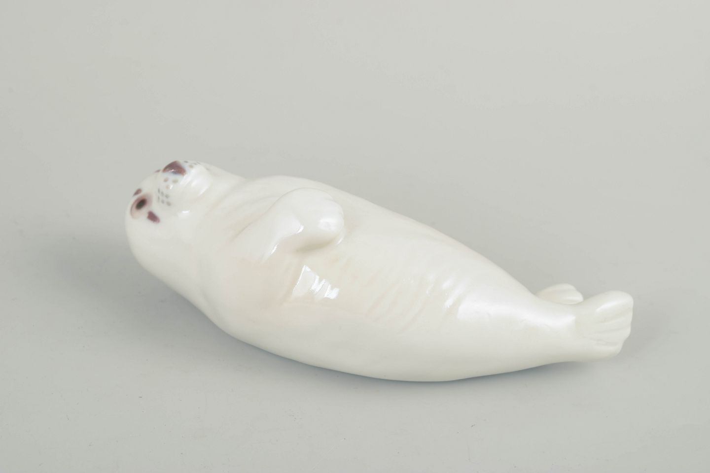 Porcelænsfigur forestillende en liggende sælunge med afrundet, blød modellering og ensfarvet hvid glasur, der fremhæver figurens rolige og naturalistiske udtryk. Model 542.