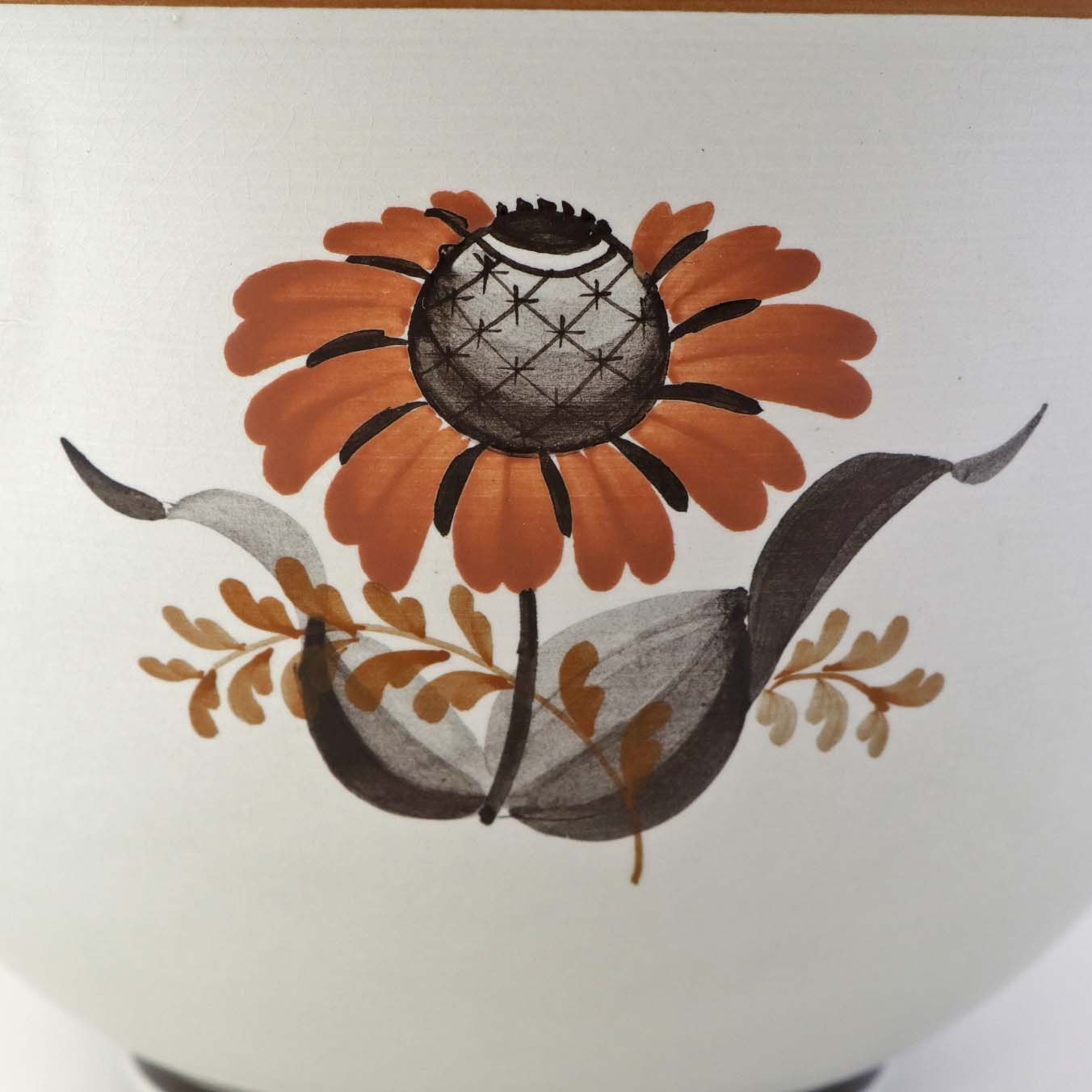 Fajancestellet er i stelformen Viktoria II med dekoration af orangebrune blomster på gråtonet baggrund med brun kant.
