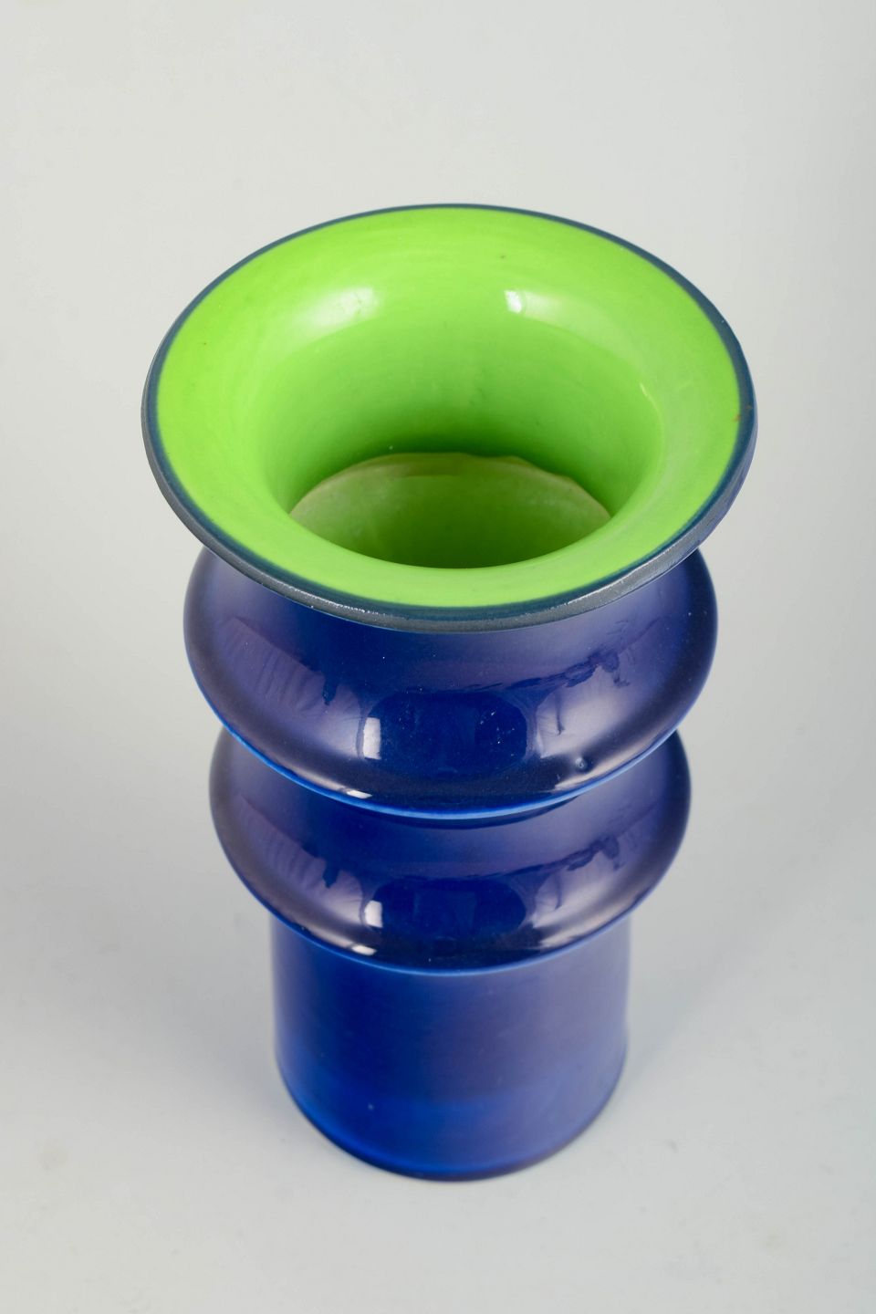 Skulpturel, balusterformet vase i glaseret stentøj med dyb koboltblå glasur og kontrasterende limegrøn glasur indvendigt; typisk 1970’er-modernisme med tydelig profilering og en markant farvevirkning.