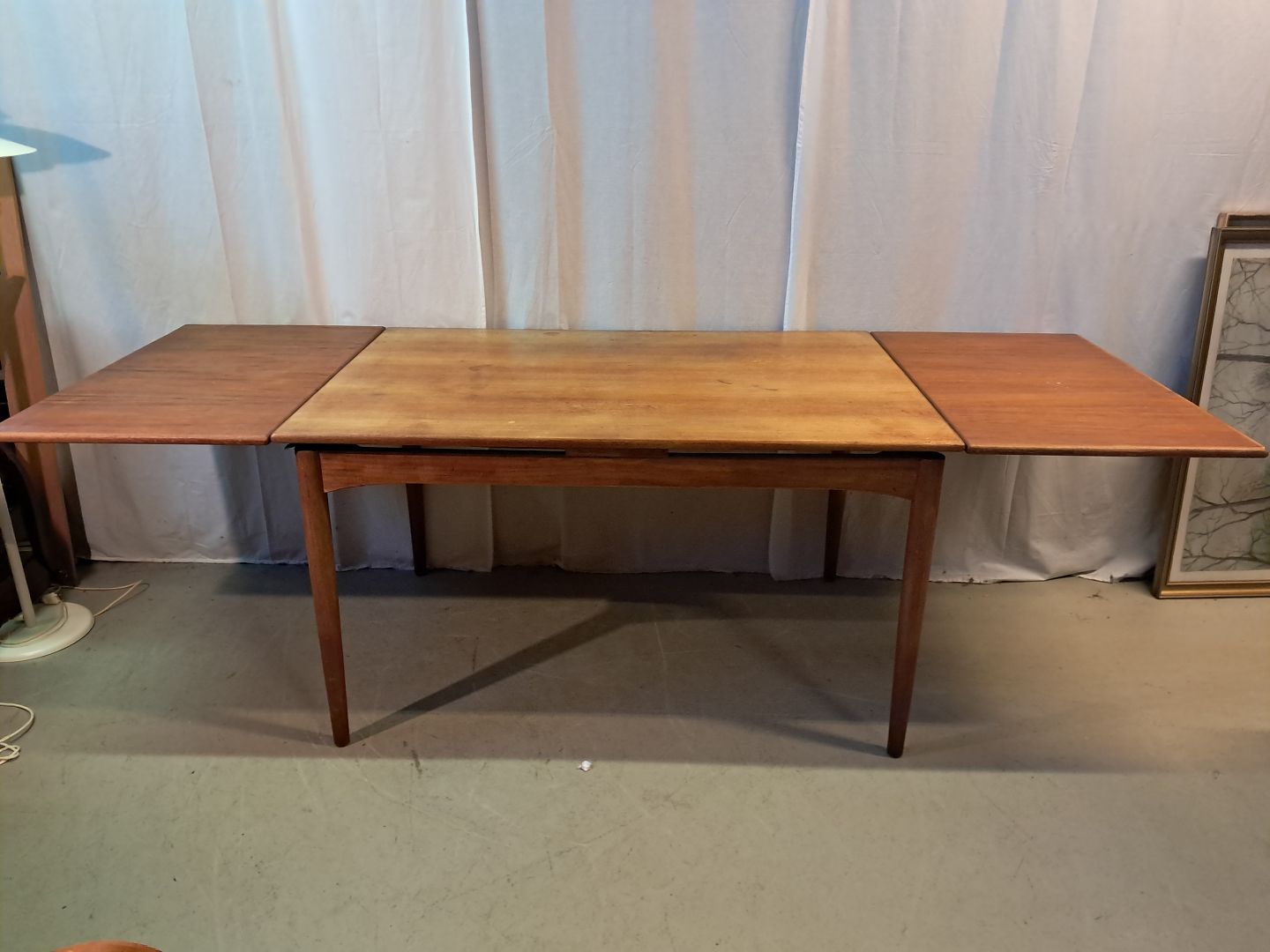Spisebord i fineret teaktræ med hollandsk udtræk, fra 1960erne.