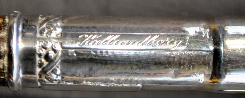 Sjælden stok i ibenholt med sølvhåndtag, 19. årh. Stemplet: 800 samt to utydelige stempler. Indgraveret: Togfören Kallundborg. Med metalspids. L: 82 cm.