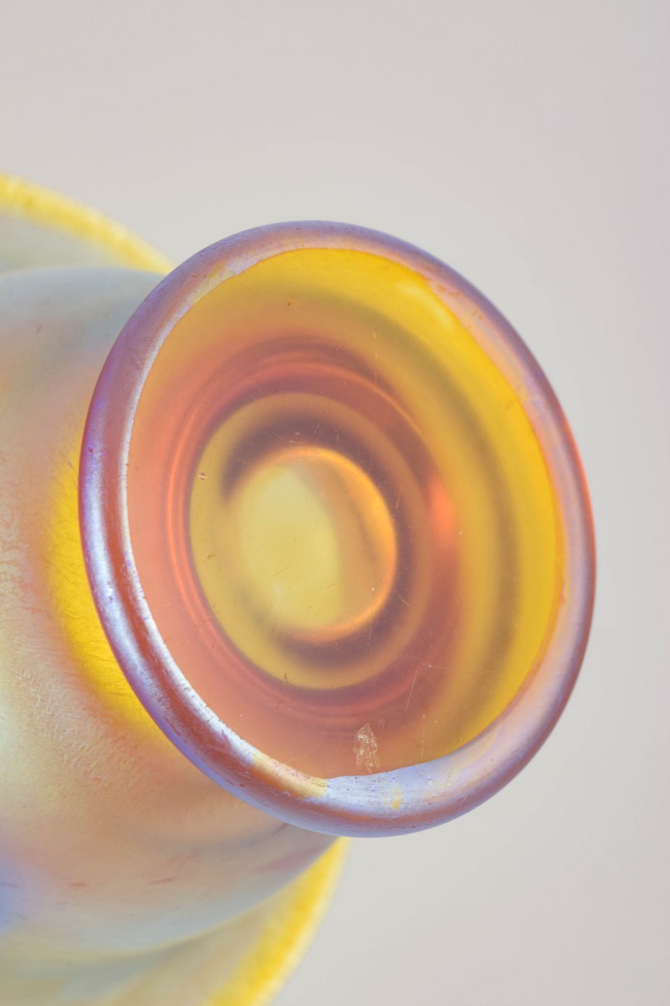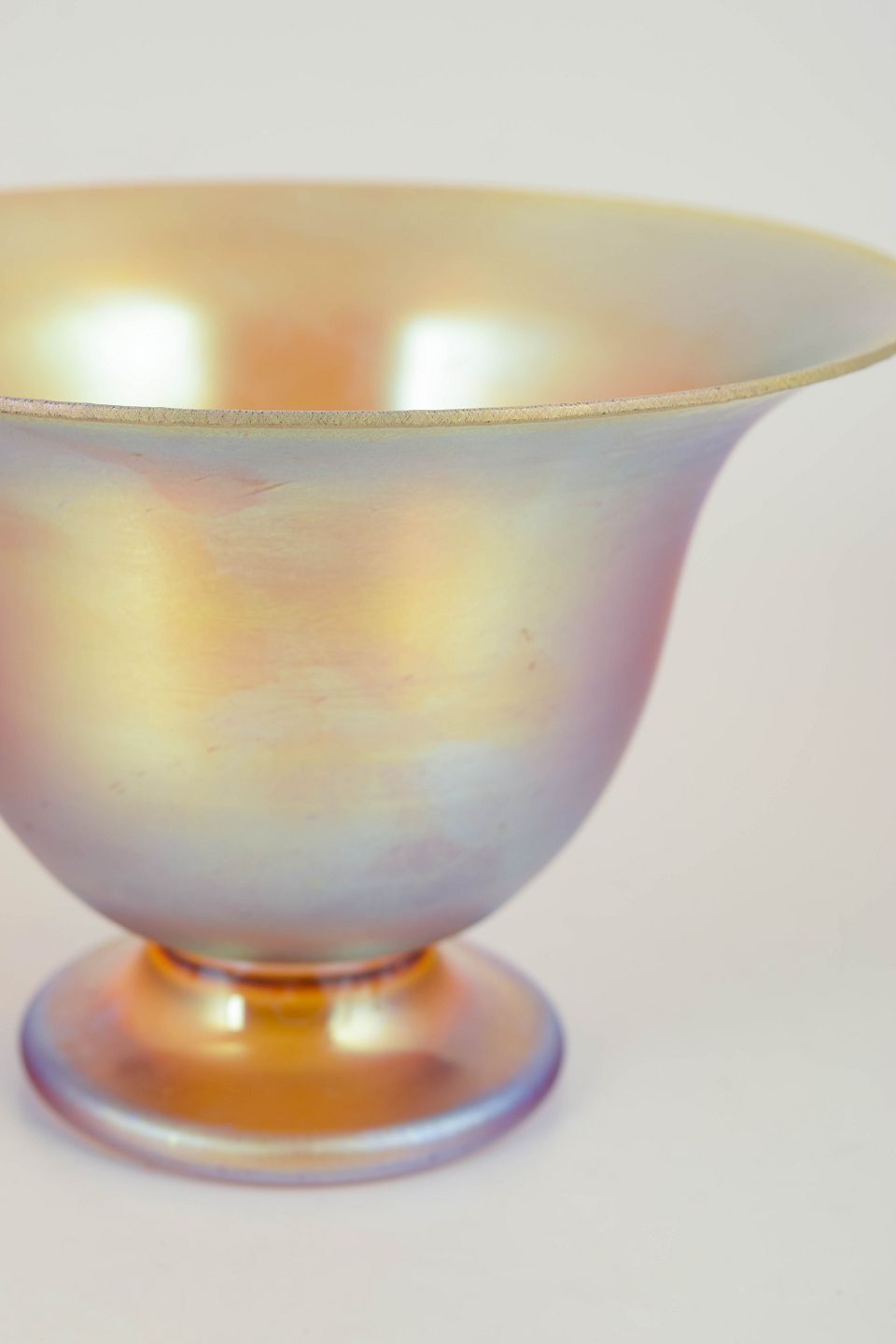 Elegant vase i iriserende kunstglas, model Myra, med blødt udsvajet rand og hævet fod; den perlemorsagtige overflade viser et fint farvespil i varme toner, karakteristisk for periodens luksusglas.
