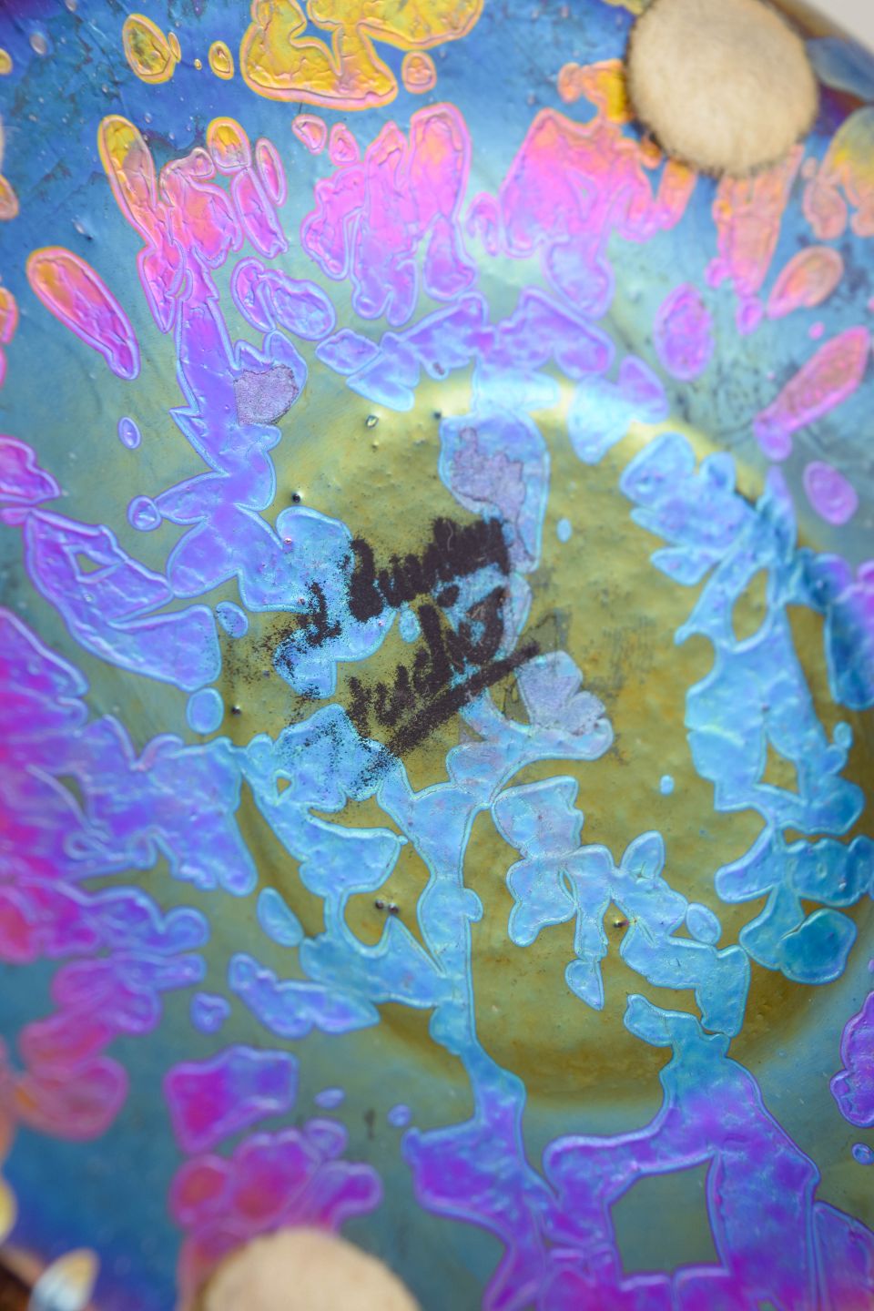 Art Nouveau parfume-forstøver i iriserende kunstglas med blåviolette og grønne nuancer samt organiske, flydende åremønstre. Kuppelformet krop med monteringer i metal og sort gummiballon med kvast. Modellen er udført som bordstående parfume-forstøver, hvor glassets farvespil og funktion forenes i et tidstypisk udtryk.